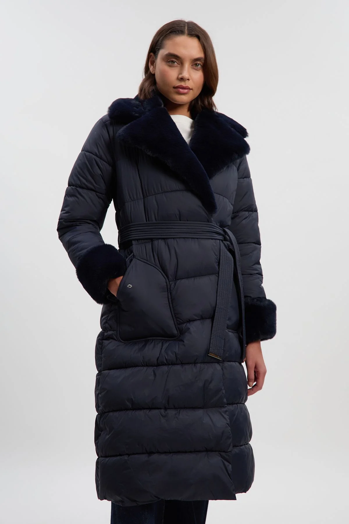Faux Fur Lined Belted Longline Puffer Coat Product Details & Care Shell: 100% Nylon. Lining: 100% Polyester. Filling: 100% Polyester. Faux Fur trim: 100% Polyester. Model wears: UK8 / US4. Model height: 5"9. Approx length: 113cm