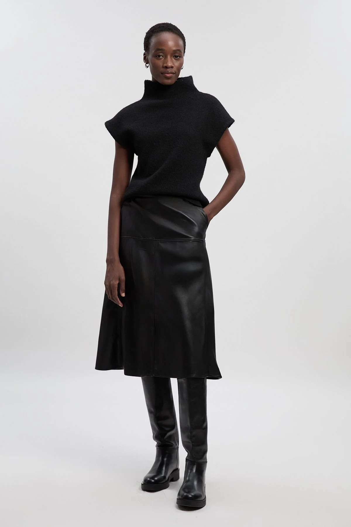 - Luxurious faux leather finish with a sophisticated sheen - Flattering full silhouette with elegant flare - Belted design to accentuate the waist - Mid-length cut perfect for versatile styling - Smooth lining for comfortable all-day wear This Karen Millen faux leather skirt combines timeless sophistication with contemporary edge. The full silhouette creates a graceful movement as you walk, while the belted detail defines your waist for a flattering shape. Style with a fitted roll neck top and chunky boots for an effortlessly chic daytime look, or pair with a crisp blouse and ballet flats for family gatherings. The versatile mid-length design works beautifully for casual coffee dates or weekend brunches. The smooth lining ensures comfort throughout the day, while the faux leather texture adds a touch of luxury to your everyday wardrobe. This piece transitions seamlessly from day to evening - simply switch your footwear and accessories to refresh your look for different occasions. Product Details & Care Main: 90% nylon, 10% elastane. Main 2: 95% nylon, 5% elastane. Lining: 95% polyester, 5% elastane. Model wears UK8/US4. Model height 5"9.