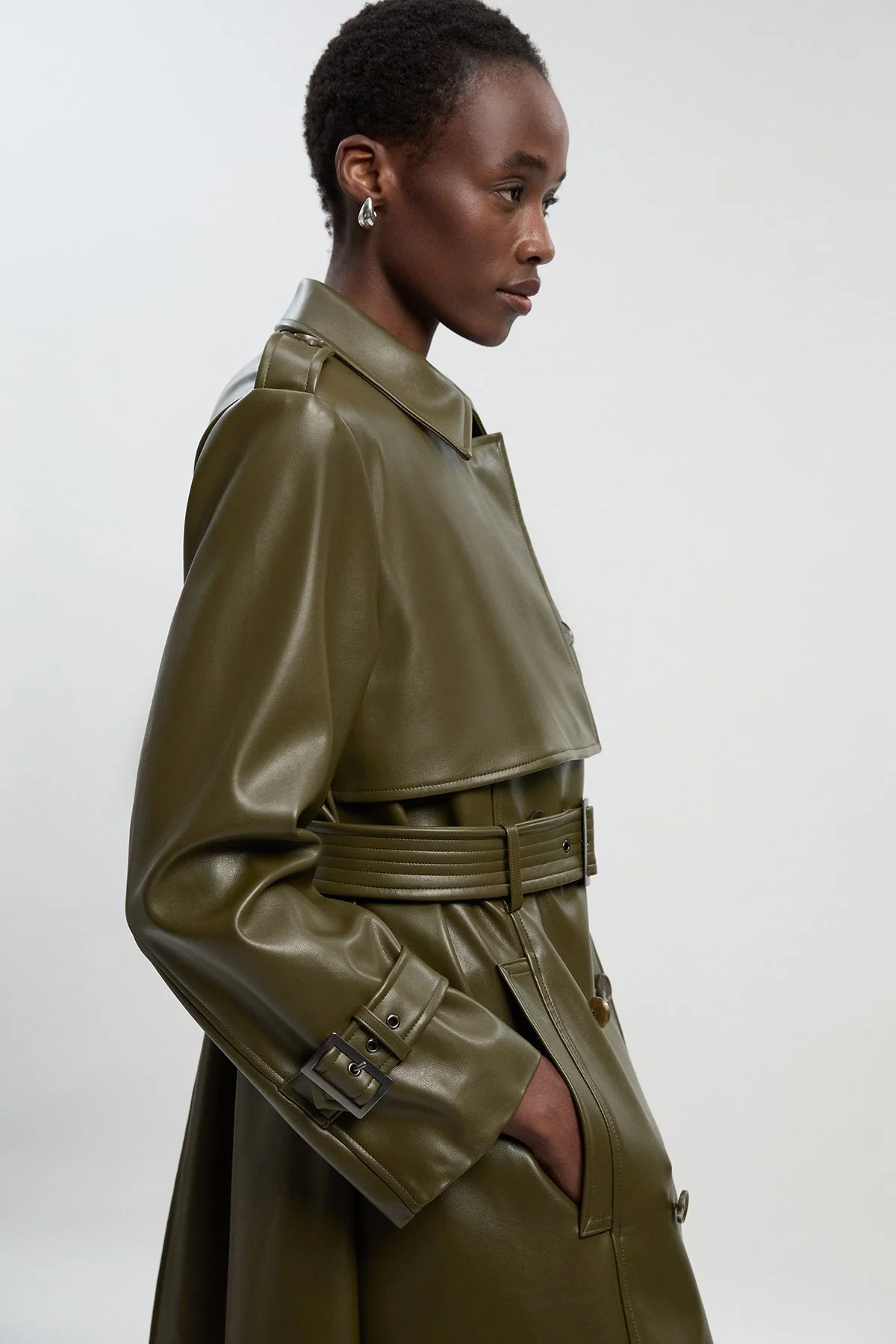 - Classic double-breasted design with statement buttons for timeless sophistication - Adjustable belted waist to create a flattering, defined silhouette - Traditional trench coat collar with epaulette detailing on shoulders - Luxurious faux leather finish that offers a contemporary edge - Practical wrist straps for additional styling versatility This Karen Millen faux leather trench coat masterfully combines classic British heritage with modern sophistication. The structured silhouette creates a polished look that transitions effortlessly from day to evening occasions. Style with a roll-neck jumper as shown for cooler days, or layer over a crisp white shirt and tailored trousers for a refined daytime ensemble. The belted waist allows you to customise your fit, creating a feminine shape that works beautifully for family gatherings or weekend brunches. For casual outings, pair with straight-leg jeans and leather ankle boots, adding a cross-body bag for practicality. This versatile piece will become a cornerstone of your autumn-to-spring wardrobe, offering both protection from the elements and a touch of understated glamour that reflects the Karen Millen commitment to expert craftsmanship. Product Details & Care Main: 90% nylon, 10% elastane. Main 2: 95% nylon, 5% elastane. Lining: 95% polyester, 5% elastane. Model wears UK8/US4. Model height 5"9. Length approx: 129cm