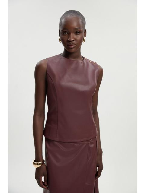 This Karen Millen faux leather top embodies sophisticated daywear with its tailored silhouette and luxurious texture. The distinctive shoulder button detailing adds a contemporary twist to this versatile piece, whilst the sleek round neckline maintains its refined character. Style with the matching skirt for a coordinated ensemble that projects confidence and poise. Accessorise with gold-tone jewellery to complement the button detailing and create a cohesive look. Sleek faux leather tailored top with a round neckline Distinctive gold-tone button detailing Sleeveless design Clean-lined silhouette with a structured fit Product Details & Care Main: 55% Polyester, 45% Polyurethane; Lining: 100% Polyester Do not wash, do not tumble dry, do not dry clean, wipe clean with a damp cloth or sponge clean only, Model wears UK 8/US 4. Model Height 5"9.