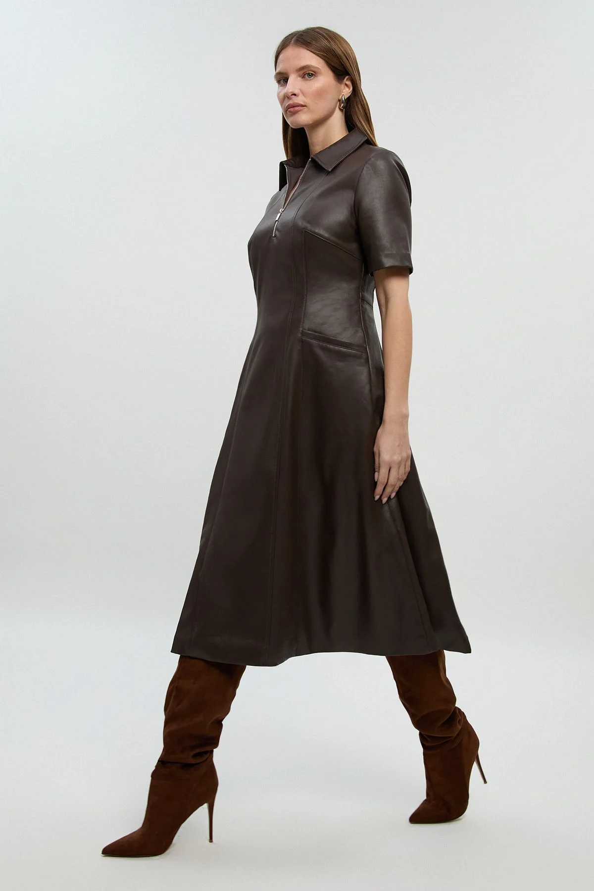 - Striking faux leather finish with a luxurious sheen and texture - Elegant collared neckline with contemporary zip front detail - Flattering midi length with a graceful A-line silhouette - Short sleeves for versatile seasonal styling - Subtle panelling creates a sophisticated structured shape This Karen Millen faux leather shirt dress combines contemporary edge with timeless sophistication. The structured A-line silhouette creates a flattering shape that moves beautifully with every step, whilst the collared neckline and zip front detail add a modern twist to a classic design. Perfect for daytime engagements, style with minimal jewellery and sleek ankle boots for family gatherings or weekend brunches. For a more casual approach, pair with white trainers and a crossbody bag for effortless city styling. The versatile midi length works wonderfully with both flats and low heels, making this a practical yet polished addition to your wardrobe. This piece exemplifies Karen Millen's commitment to expert craftsmanship and contemporary design that transitions seamlessly from day to evening. Product Details & Care Main: 55% Polyester, 45% Polyurethane, Lining: 100% Polyester. Model wears UK 8/US 4. Model Height 5"9.