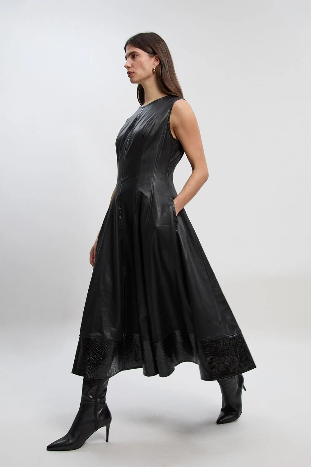 - Striking croc-embossed detailing along the hemline creates a luxurious textural contrast - Sleeveless design with a flattering round neckline for effortless sophistication - Expertly tailored seams that contour the figure for a feminine silhouette - Full midi skirt with elegant flare and practical side pockets - Wipe-clean faux leather finish offering both style and practicality for everyday wear This Karen Millen faux leather midi dress showcases contemporary craftsmanship with its structured silhouette and distinctive croc-embossed detailing. The round neckline and sleeveless cut create a refined canvas that allows the sumptuous texture to take centre stage. Style with pointed ankle boots as shown for a modern daytime look, or pair with white trainers and an oversized knit cardigan for casual weekend brunches. The practical side pockets add functionality without compromising on form, while the midi length offers versatility for various occasions. Perfect for family gatherings or lunch with friends, this piece demonstrates how statement dressing can work for daywear. Add minimal jewellery and a structured tote to complete a look that balances sophistication with everyday wearability - a true embodiment of the polished yet contemporary Karen Millen aesthetic. Product Details & Care Main & contrast: 55% polyester, 45% polyurethane. Lining: 90% polyamide, 10% elastane. Wipe clean with damp cloth/sponge only. Model wears UK8/US4. Model height 5"9. length approx: 120cm