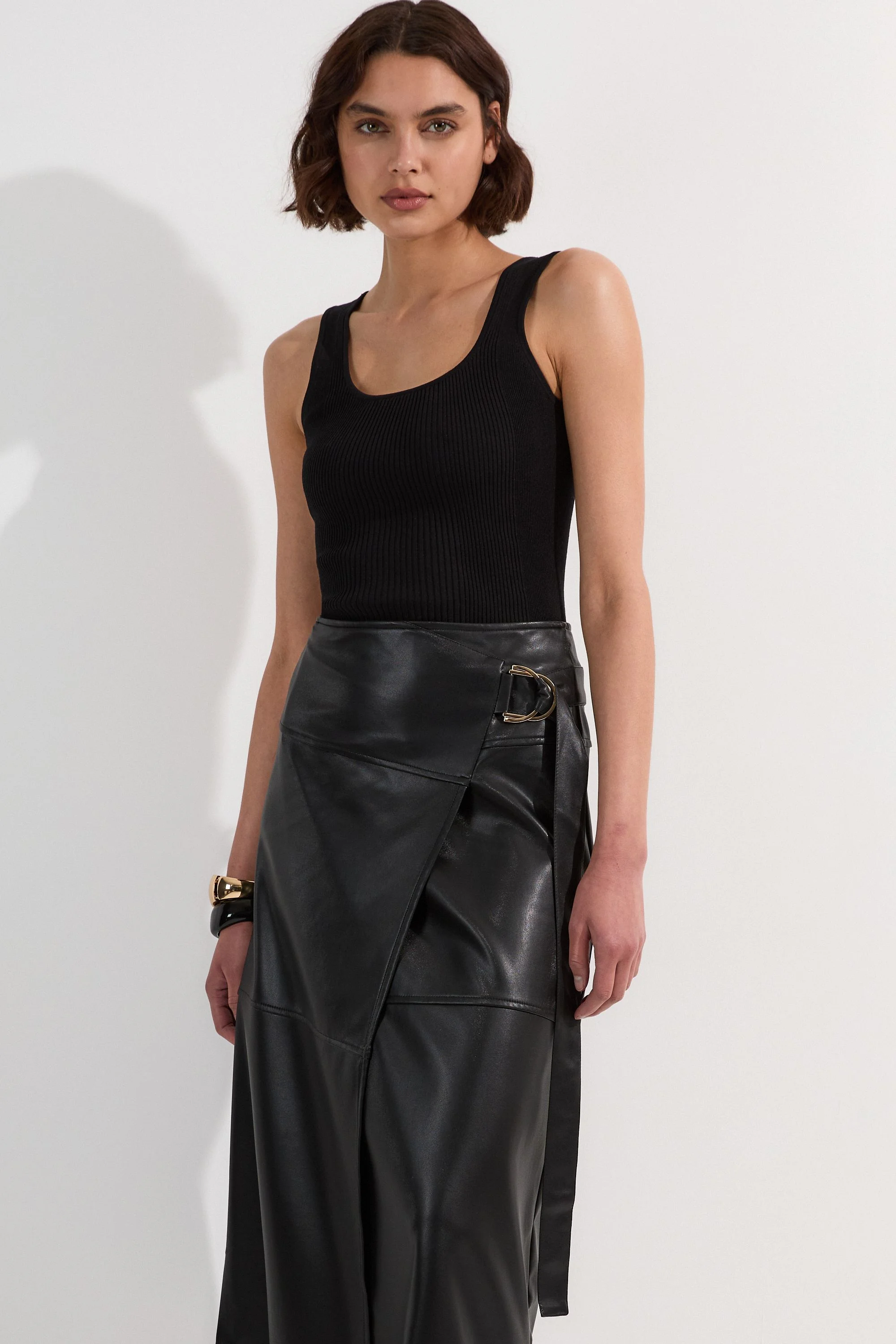 This Karen Millen wrap midi skirt combines timeless sophistication with modern edge. The asymmetric wrap design creates a flattering silhouette that moves with every step, while the tie detail allows for adjustable styling. Perfect for daytime outings, style with a fitted black top for a classic pairing, or introduce a chunky knit jumper for cooler weather. This skirt transitions effortlessly from day to evening. Simply swap your daytime accessories for statement jewellery and a structured clutch for dinner dates or gallery events. Wrap design with tie detail Midi length Faux leather finish Statement buckle fastening Panelled construction Product Details & Care Main: 55% Polyester. 45% Polyurethane. Lining: 100% Polyester. Wipe clean with a damp cloth or sponge clean only. Model wears UK Size 8/ US Size 4. Model height approx: 5"9. Length approx: 85cm