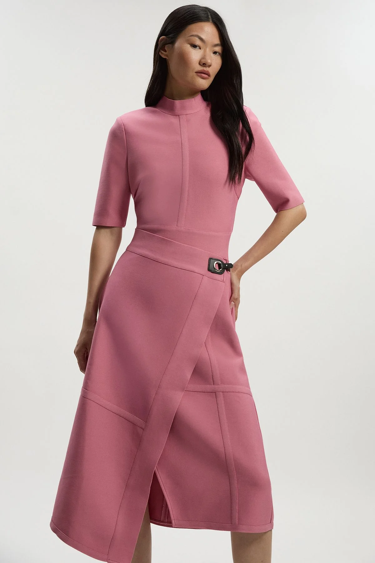 - Striking asymmetric hemline creates a contemporary silhouette - Figure-enhancing bandage knit construction that sculpts the body - Elegant half-sleeve design offers versatile seasonal wear - Sophisticated high neckline adds a refined touch - Distinctive metal hardware detail at the waist for added interest The Figure Form Bandage Asymmetric Knit Midi Dress from Karen Millen showcases exceptional craftsmanship with its architectural design. The structured knit fabric gently contours your silhouette while the asymmetric neckline and hemline create visual intrigue. Perfect for daytime sophistication, style with minimal jewellery and strappy sandals for lunch with friends, or dress down with white trainers and a crossbody bag for weekend gallery visits. The midi length offers practicality without compromising on style, while the half-sleeve design transitions effortlessly between seasons. For family gatherings or casual work events, layer with a tailored blazer and ankle boots to enhance the contemporary aesthetic. This versatile piece embodies the polished yet modern sensibility that defines the Karen Millen woman. Product Details & Care Main: 97% Recycled Polyester, 3% Elastane/Spandex. Wash with similar colours on a 30 degree synthetic cycle. Model wears UK Size S. Model height approx: 5"9. Length approx: 118cm