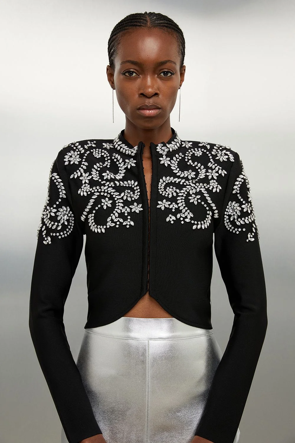 The Figure Form Bandage Embellished Knit Jacket from Karen Millen showcases expert craftsmanship with its intricate embellishment work that adds texture and visual interest to your ensemble. This cropped jacket pairs with high-waisted trousers or skirts for a balanced silhouette. The structured knit fabric offers comfortable stretch while maintaining its shape throughout the day, making this a versatile addition to your wardrobe that combines practicality with Karen Millen's signature polished aesthetic. Embellished detailing across the shoulders and neckline Cropped silhouette with curved hem Slim fit design Front zip closure Crew neckline Product Details & Care Main: 97% Polyester, 3% Elastane. Cool hand wash. Model wear UK size Small. Models height approx: 5"9.