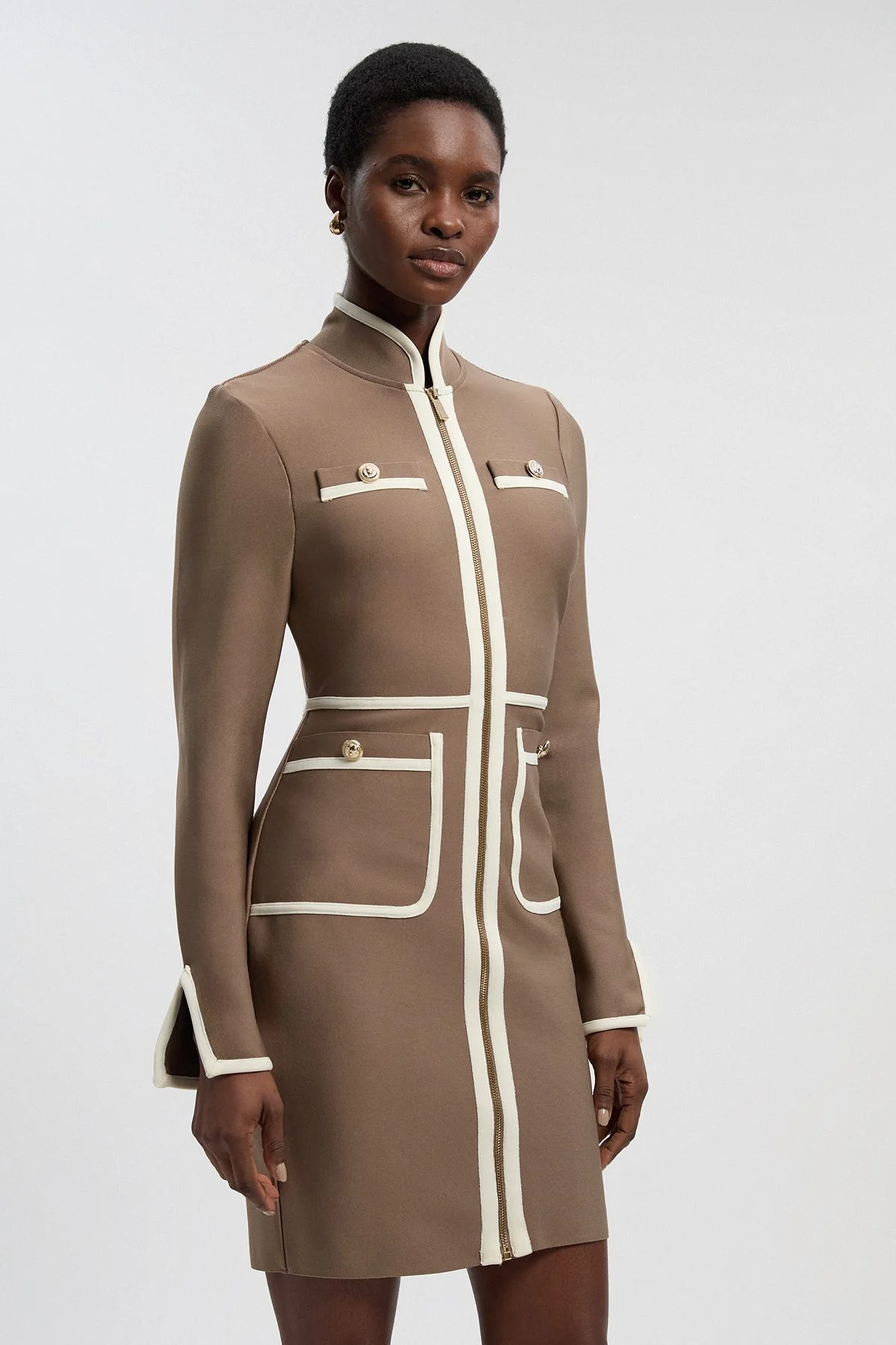 - Striking military-inspired design with contrast piping detail throughout - Sophisticated high neckline for a refined silhouette - Structured bandage knit fabric that sculpts and defines your figure - Decorative gold-tone button accents on the chest and pocket detailing - Sleek front zip closure with clean lines for a contemporary finish Command attention in this Figure Form Bandage Knit Mini Dress from Karen Millen. The military-inspired design combines authority with elegance through its structured silhouette and contrast piping. The high neckline and mini length create a balanced proportion that works wonderfully for corporate events and sophisticated evening occasions. Style with pointed court shoes and minimal jewellery for boardroom meetings, or transition to evening with statement earrings and a structured clutch. The form-fitting bandage knit construction ensures a flattering fit that maintains its shape throughout wear. This versatile piece can be dressed down with ankle boots and a tailored coat for smart-casual settings, making it an indispensable addition to your wardrobe that bridges the gap between professional polish and contemporary style. Product Details & Care Main: 97% recycled polyester, 3% elastane/spandex. Wash with similar colours. Iron on reverse side. Model height 5"9. Model wears size: UK10/US6. Item length 83cm.