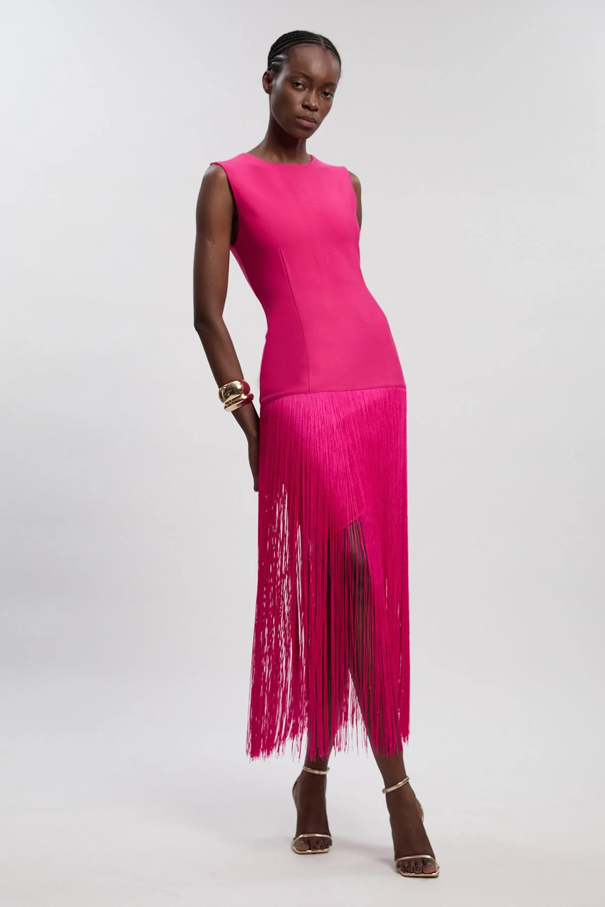 - Striking bandage knit construction creates a form-fitting silhouette - Dramatic tassel hem adds movement and dimension to this statement piece - Sleeveless crew neckline design offers a refined yet contemporary look - Midi length with sheer tassel overlay creates an elegant tiered effect - Figure-enhancing structured bodice transitions beautifully into the flowing tassel detail Make an unforgettable entrance in this sophisticated Figure Form Bandage Tassel Hem Knitted Dress from Karen Millen. The expertly crafted bandage construction gently contours your silhouette, whilst the dramatic tassel hem creates captivating movement with every step. Perfect for formal occasions, this dress combines contemporary design with timeless elegance. Style with matching heeled sandals as shown for a coordinated finish, or contrast with metallic accessories for evening events. The versatile crew neckline allows for statement jewellery to truly shine. This exceptional piece transitions effortlessly from wedding guest attire to race day ensemble, embodying the refined craftsmanship Karen Millen is renowned for. The contrast between the structured bodice and fluid tassel movement creates a truly memorable silhouette that commands attention whilst maintaining sophisticated charm. Product Details & Care Main: 97% Recycled Polyester, 3% Elastane/Spandex. Trim: 100% Polyester. Wash on a 30 degree synthetic cycle with similar colours. Iron on reverse side. Dry clean co-ordinated garment together. Model wears UK size 10. Models height approx:5"9. Length approx: 140cm.