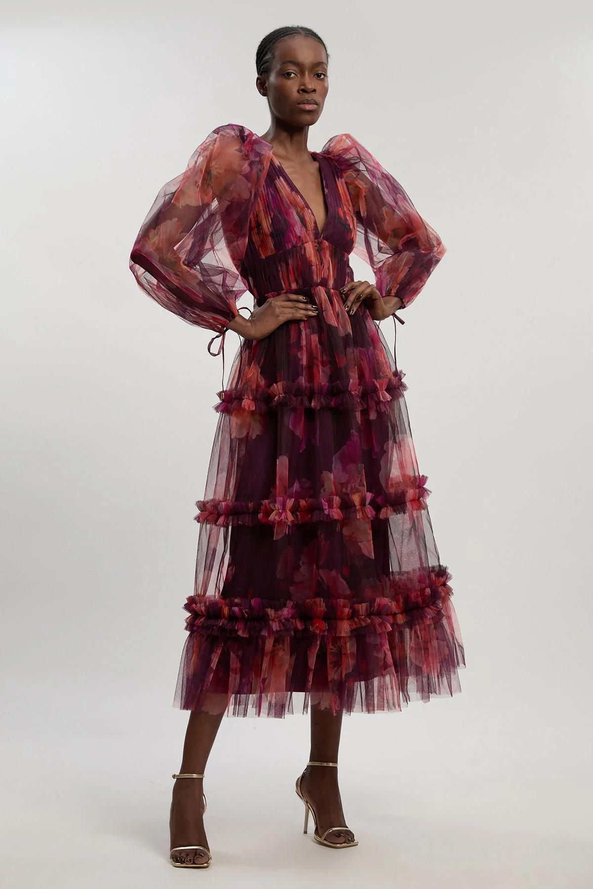 - Dramatic balloon sleeves with delicate tulle overlay create a statement silhouette - Plunge neckline adds a sophisticated touch to this occasion-ready design - Tiered skirt with ruffle detailing for dimensional texture and movement - Floral pattern printed on sheer tulle for an ethereal, romantic aesthetic - Midi length with a flowing silhouette perfect for elegant events Make an entrance at your next special occasion in this enchanting tulle maxi dress from Karen Millen. The striking balloon sleeves frame the deep plunge neckline, creating a balanced silhouette that commands attention. The tiered construction with delicate ruffle detailing adds dimension and movement as you glide across the room. Style with minimal strappy heels as shown for a contemporary finish that allows the dress to remain the focal point. This piece transitions beautifully from summer weddings to autumn galas-simply add a tailored blazer and switch to closed-toe heels for cooler evenings. The expert craftsmanship is evident in every detail, from the carefully placed tiers to the thoughtful proportions that flatter the figure. A true investment piece that epitomises modern occasion dressing with its blend of drama and refinement. Product Details & Care Shell: 100% Polyester, Lining: 100% Polyester, wash a delicate cycle, do not bleach, do not tumble dry, do not dry clean, Model wears UK 8/US 4. Model Height 5"9. Length approx: 132cm