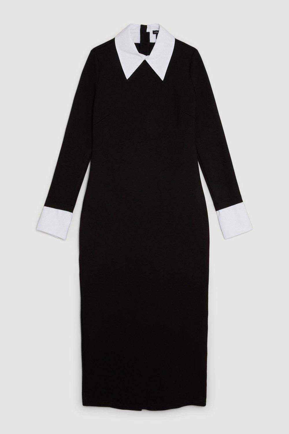 Defined by a large sharp collar, this sleek midi dress exudes a sophisticated mood. Long sleeves and a midi hemline create a streamlined silhouette, style this piece with court heels for a sharp and polished outfit.Collared neckMidi hemlineLong sleevesDiscover this seasons jersey dresses or browse the full collection of women's dresses now. Product Details & Care 68% Viscose/Rayon 28% Polyamide 4% Elastane/Spandex. Main/Contrast: 60% Cotton 37% Polyamide 3% Elastane/Spandex. Gentle machine wash at 30 with similar colours. Wash inside out. Model wears a UK S. Centre back length of a S: 135cm