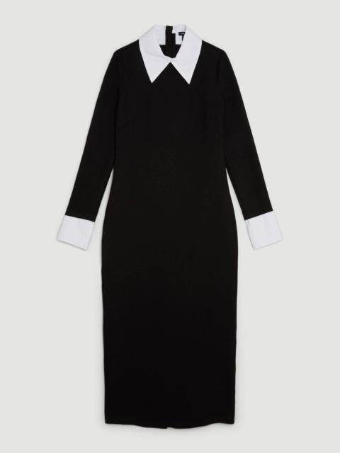 - Elegant V-neck design with a sophisticated pussy bow tie detail at the neckline - Graceful long sleeves with gathered cuffs for a refined silhouette - Flattering cinched waistline with subtle belt detailing - Beautiful pleated skirt section creates movement and dimension - Midi length offers versatility for various daytime occasions This Jersey Ponte Georgette Mix Midi Dress combines contemporary elegance with everyday wearability. The contrasting textures of structured jersey bodice and flowing georgette pleats create a harmonious balance that's both comfortable and sophisticated. Style with pointed ankle boots as shown for a modern daytime look, or pair with ballet flats and a structured tote for family gatherings. The versatile midi length works beautifully for lunch dates, gallery visits or casual office days. For cooler weather, layer with a tailored blazer or lightweight cardigan to maintain the dress's refined lines. The tie-neck detail can be worn loosely draped or neatly tied, allowing you to customise your look while maintaining the dress's polished aesthetic that embodies the Karen Millen signature style. Product Details & Care Main: 64% Viscose/Rayon, 31% Polyamide, 5% Elastane/Spandex. Main & Contrast: 100% Polyester. Lining: 95% Polyester, 5% Elastane/Spandex. Wash inside out. Wash with similar colours. Iron on reverse. Do not bleach. Do not tumble dry. Model wears UK size Small. Models height approx: 5''9. Length approx: 133cm