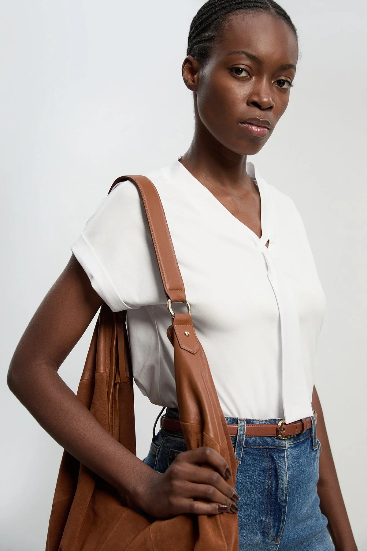 - Elegant V-neck design with distinctive tie detail for added sophistication - Soft jersey cotton fabric offers exceptional comfort for all-day wear - Relaxed cap sleeves create a flattering silhouette - Regular fit provides effortless movement and versatility - Timeless design that transitions seamlessly from day to evening This refined jersey t-shirt exemplifies understated elegance with its distinctive tie detail at the V-neckline. The clean lines and thoughtful design make it a versatile addition to your wardrobe that works brilliantly across multiple settings. Pair with tailored trousers and a structured blazer for a polished office ensemble, or style with your favourite denim and statement earrings for sophisticated weekend brunches. The relaxed cap sleeves and comfortable regular fit ensure you maintain a put-together appearance without compromising on comfort. Made from cotton jersey, this t-shirt offers breathability and a gentle drape that complements its contemporary design. Perfect for the woman who appreciates subtle details and craftsmanship in her everyday essentials, this Karen Millen piece will quickly become a cornerstone in your capsule wardrobe. Product Details & Care Main: 100% Cotton. Machine wash. Models wears UK size Small. Models height approx: 5"9.