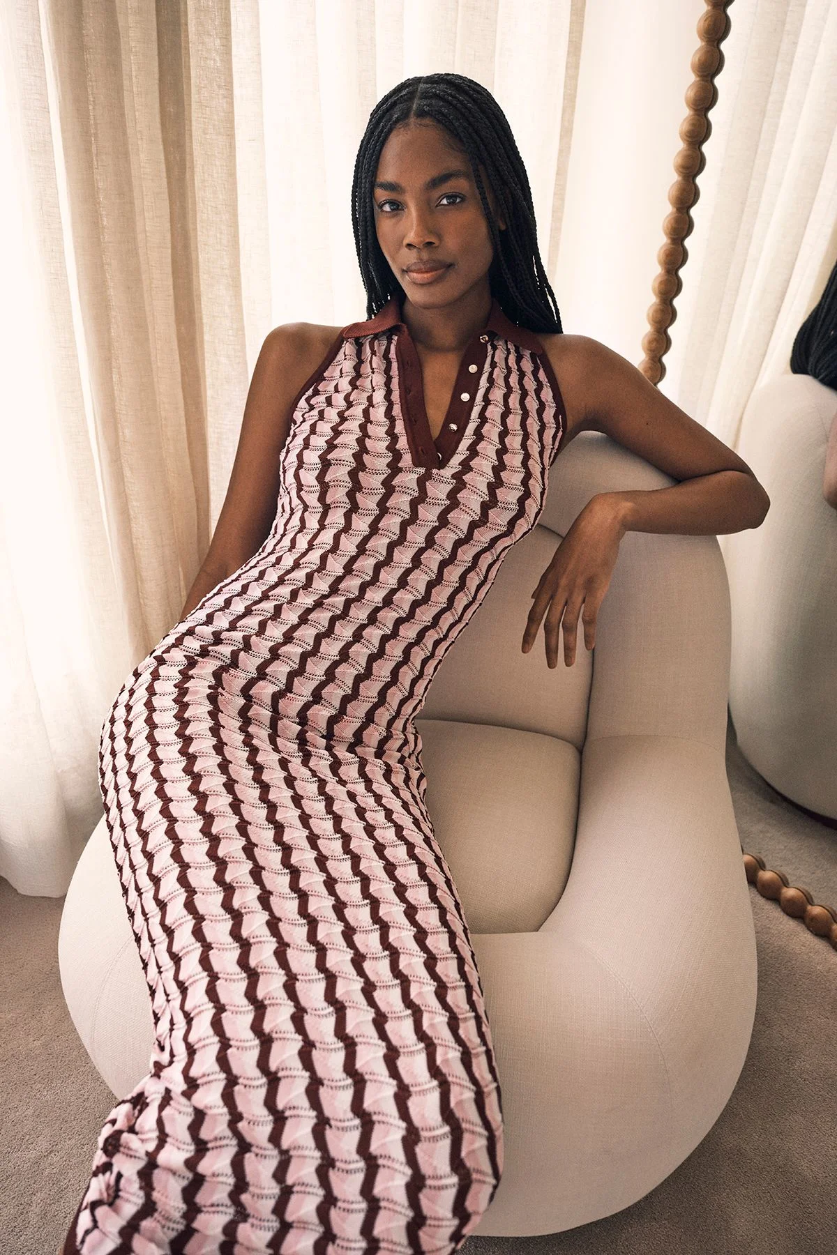 - Sleeveless midi dress featuring distinctive pointelle knit pattern throughout - Contrast collar with button placket detail for a refined touch - Figure-defining silhouette with a sophisticated midi length - Ribbed trim along the hemline creates a polished finish - Versatile design that transitions effortlessly from day to evening occasions This Karen Millen knit midi dress embodies contemporary sophistication with its striking pointelle pattern and contrast collar detail. The sleeveless design offers a refined silhouette that contours to your form without compromising on comfort. Style with leather slide sandals and a structured handbag for elevated daytime engagements, or transform your look for evening soirees with strappy heels and statement earrings. The midi length presents the perfect canvas for showcasing elegant footwear, while the collared neckline adds a smart element that works wonderfully beneath a tailored blazer for business meetings. This versatile piece demonstrates expert craftsmanship through its intricate knit construction, making it an essential addition to the wardrobe of any discerning woman who appreciates attention to detail and timeless design. Product Details & Care Main: 63% Viscose, 37% Polyamide. Machine wash. Due to the delicate nature of this fabric, care must be taken with jewellery and rough surfaces. Models wears UK size Small. Models height approx: 5"9. Length approx 126cm.