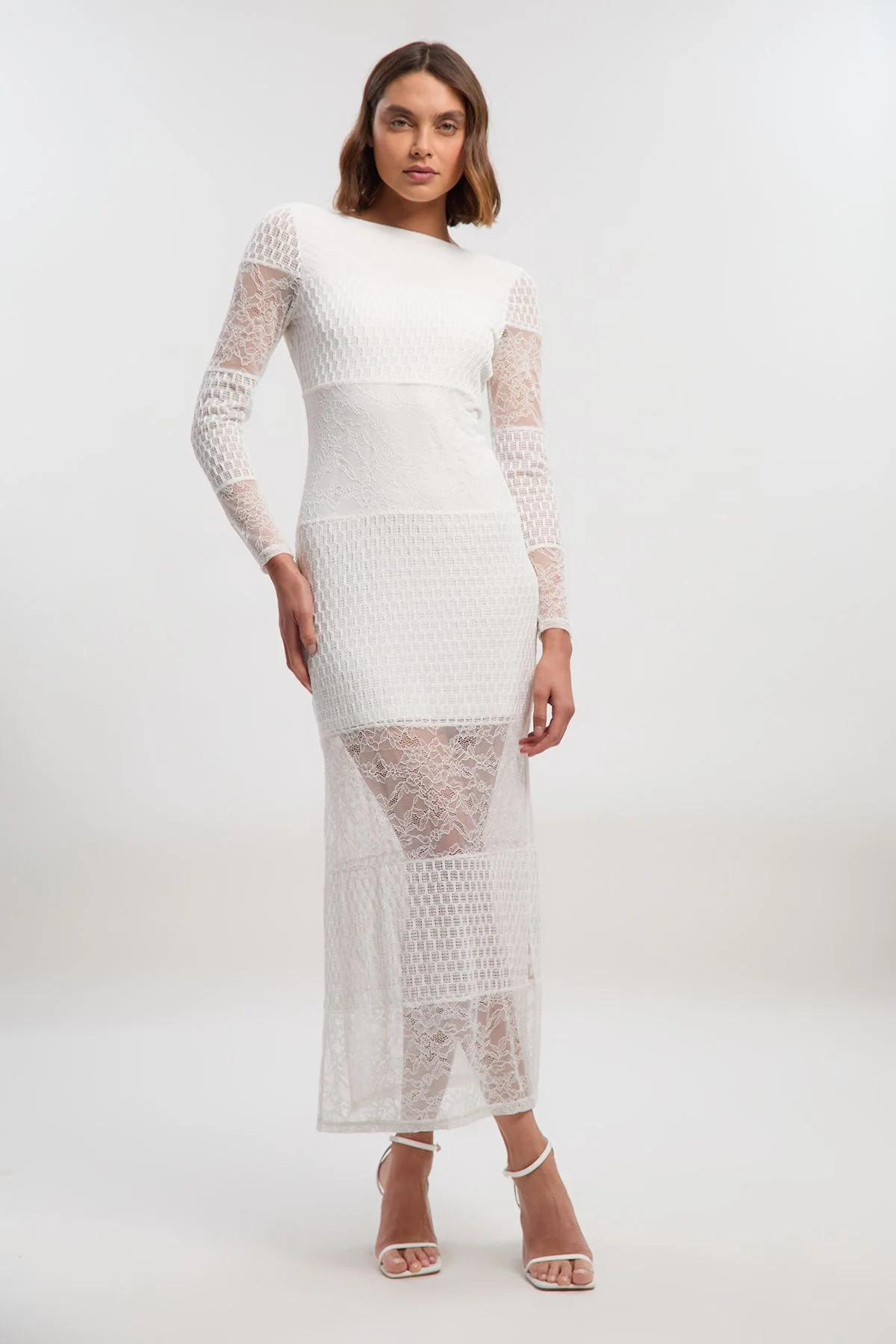 - Striking lace textured midi dress with elegant long sleeves - Sophisticated crew neckline complemented by a daring low back design - Figure-enhancing silhouette with a fitted bodice and waist - Captivating sheer lace panels create a contemporary layered effect - Midi length offers versatile styling options for various daytime occasions This Karen Millen lace textured midi dress showcases contemporary sophistication with its artful combination of textures. The fitted bodice gracefully highlights your silhouette while the sheer lace panels add a subtle hint of allure without compromising on elegance. Perfect for elevated daywear, this piece transitions effortlessly from family gatherings to brunches with friends. Style with strappy heels as shown for a polished look, or dress down with refined flats and a structured blazer for more casual affairs. The versatile midi length works beautifully with a cropped jacket for cooler days, while delicate jewellery will complement rather than compete with the intricate lace detailing. This dress embodies the Karen Millen ethos of expert craftsmanship and contemporary design, making it a standout addition to your daywear collection. Product Details & Care Main: 96% polyester, 4% elastane. Model wears UK8/US4. Model height 5"9. Length approx: 120cm