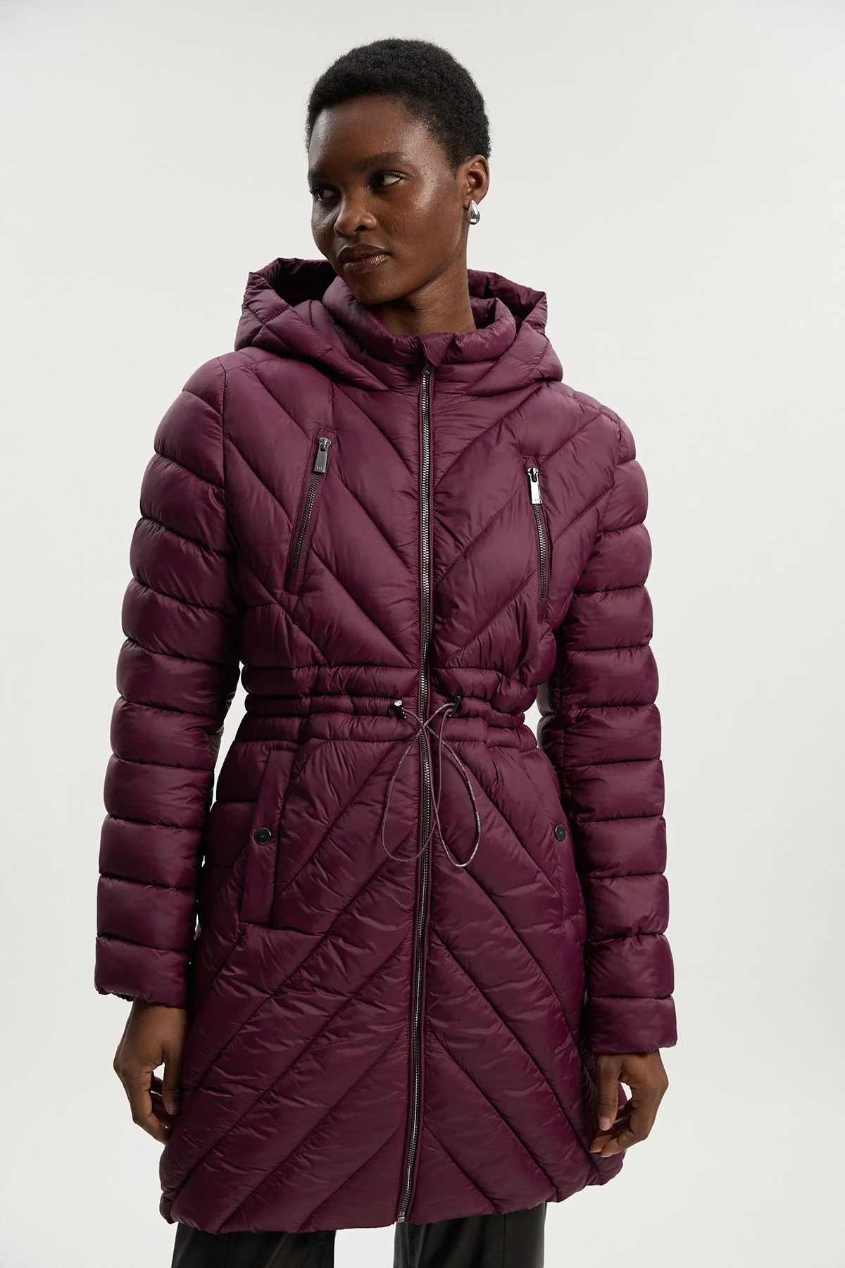 This Karen Millen Lightweight Packable Coat combines practicality with sophisticated style. The thoughtfully designed quilted pattern not only adds visual interest but also providesive warmth in cooler weather. The adjustable belted waist allows you to customise your silhouette, creating definition whilst maintaining comfort. Its packable nature makes it an ideal travel companion, easily stowed away when not needed. The functional hood and high neck provide additional protection against the elements, ensuring you remain stylish whilst staying warm. Lightweight packable design Quilted pattern with diagonal stitching Practical high neck and hood Functional side zip pockets Belted waist detail Product Details & Care Main 52% recycled Polyamide 48% Polyamide Filling: 100% Recycled Polyester Wash with similar colours. Iron on reverse. 30 degrees synthetic cycle. Do not tumble dry. Do not dry clean. Model height 5"9. Model wears size UK8/US4. Length approx 123cm.