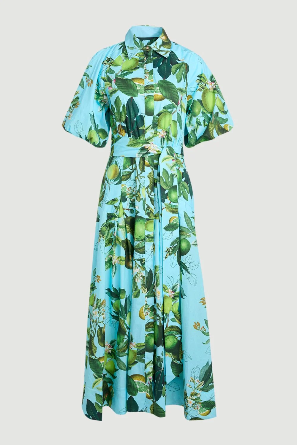 - Crafted from pure cotton for breathable comfort throughout the day - Dramatic puff sleeves add architectural interest and contemporary flair - Dropped waist silhouette creates a relaxed yet refined shape - Collared neckline with button-through front for versatile styling options - Self-tie belt to define and customise the waistline to your preference This striking printed midi shirt dress embodies sophisticated summer dressing with its artistic botanical pattern and considered design details. The combination of structured collar and voluminous puff sleeves creates a balanced silhouette, while the dropped waist adds a modern twist to the classic shirt dress. Style with minimal jewellery and flat leather sandals for garden parties or weekend brunches. For more formal daytime events, pair with block-heeled mules and a structured tote bag. The cotton construction ensures all-day comfort even in warmer weather, making this a versatile addition to your warm-weather wardrobe. The midi length offers appropriate coverage for various occasions whilst maintaining an effortlessly elegant aesthetic that aligns perfectly with Karen Millen's commitment to contemporary sophistication and expert craftsmanship. Product Details & Care Main: 100% cotton, lining: 100% cotton, wash inside out, wash with similar colours, Model wears UK 8/US 4. Model Height 5"9. Length approx: 120cm