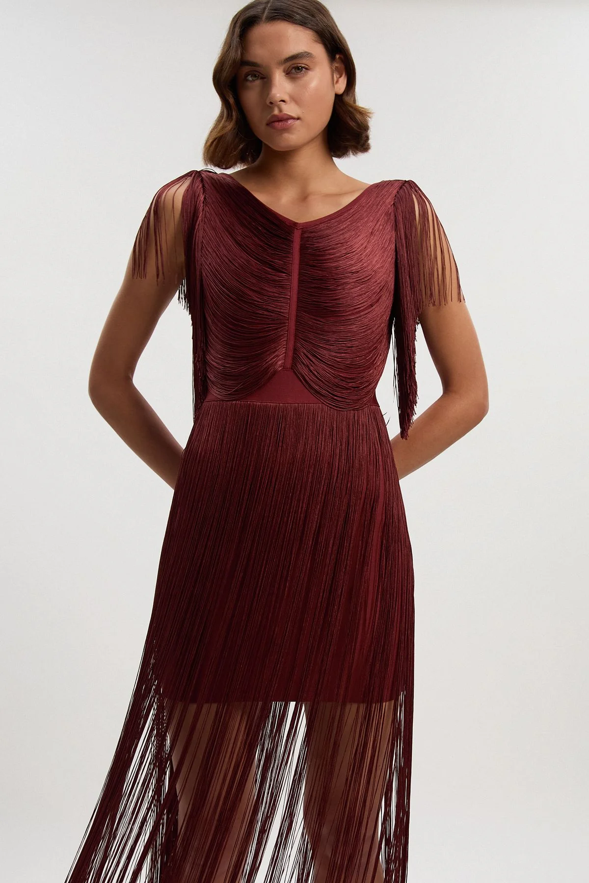 Make a dramatic entrance in this Karen Millen knitted mini dress that combines contemporary design with show-stopping fringe detailing. The clever construction features a fitted mini dress base with cascading fringe that creates the illusion of a flowing maxi length. The draped bodice adds dimension while the round neckline keeps the look balanced. This conversation-starting piece requires little accessorising, simply add delicate gold jewellery to complete your look. Dramatic fringe detailing cascades from the bodice and skirt Round neckline Mini dress base with maxi-length fringe overlay Sleeveless design Knitted fabric Product Details & Care Main: 97% Polyester, 3% Elastane/Spandex, Trim: 100% Polyester. Wash with similar colours. Iron on reverse side. Dry clean co ordinated garments together. Due to the delicate nature of the tassel trim, some loss and/or breakage of individual tassels may occur. Model wears UK Size 8/ US Size Small. Model height approx: 5"9. Length approx: 140cm