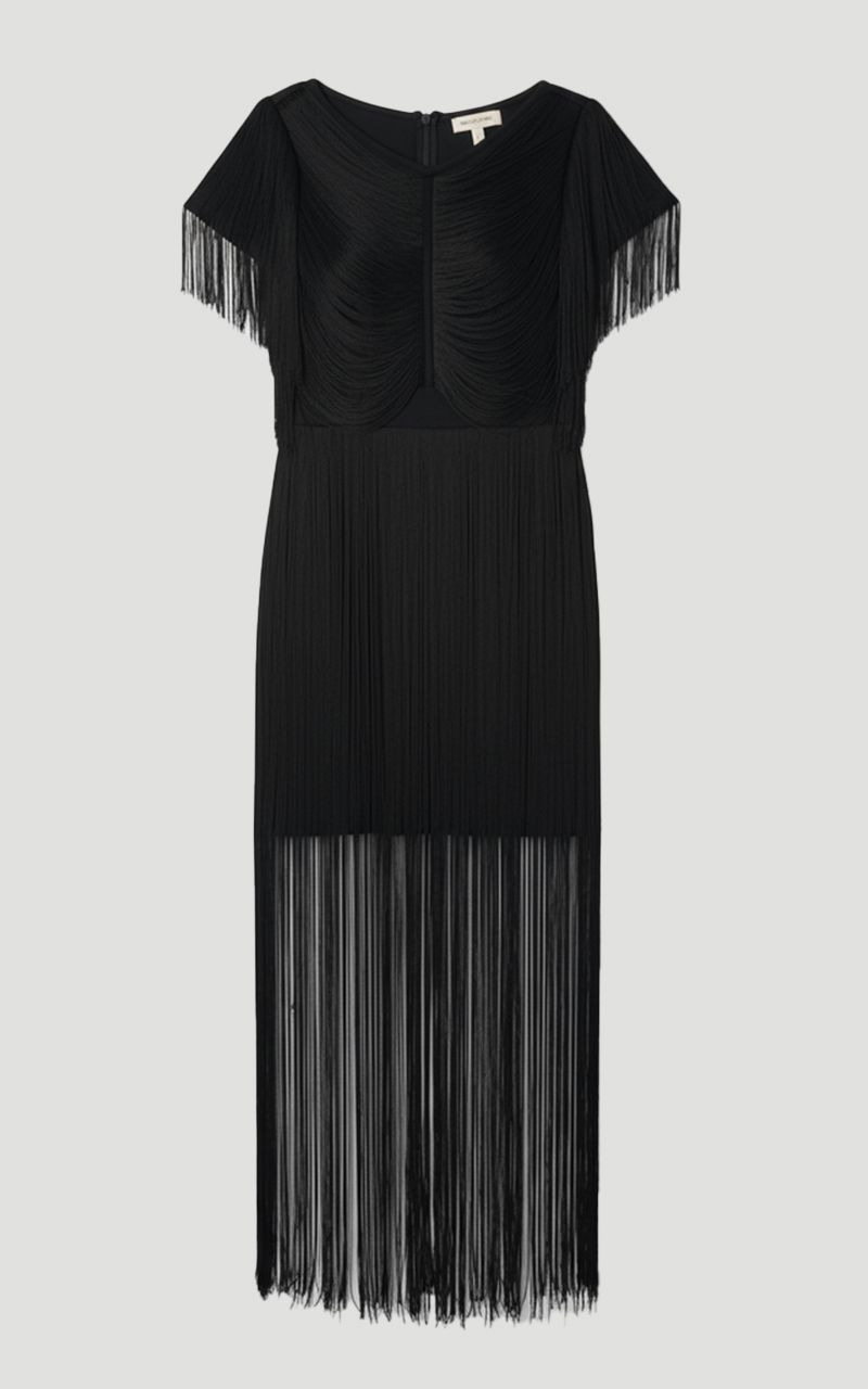Make a dramatic entrance in this Karen Millen knitted mini dress that combines contemporary design with show-stopping fringe detailing. The clever construction features a fitted mini dress base with cascading fringe that creates the illusion of a flowing maxi length. The draped bodice adds dimension while the round neckline keeps the look balanced. This conversation-starting piece requires little accessorising, simply add delicate gold jewellery to complete your look. Dramatic fringe detailing cascades from the bodice and skirt Round neckline Mini dress base with maxi-length fringe overlay Sleeveless design Knitted fabric Product Details & Care Main: 97% Polyester, 3% Elastane/Spandex, Trim: 100% Polyester. Wash with similar colours. Iron on reverse side. Dry clean co ordinated garments together. Due to the delicate nature of the tassel trim, some loss and/or breakage of individual tassels may occur. Model wears UK Size 8/ US Size Small. Model height approx: 5"9. Length approx: 140cm