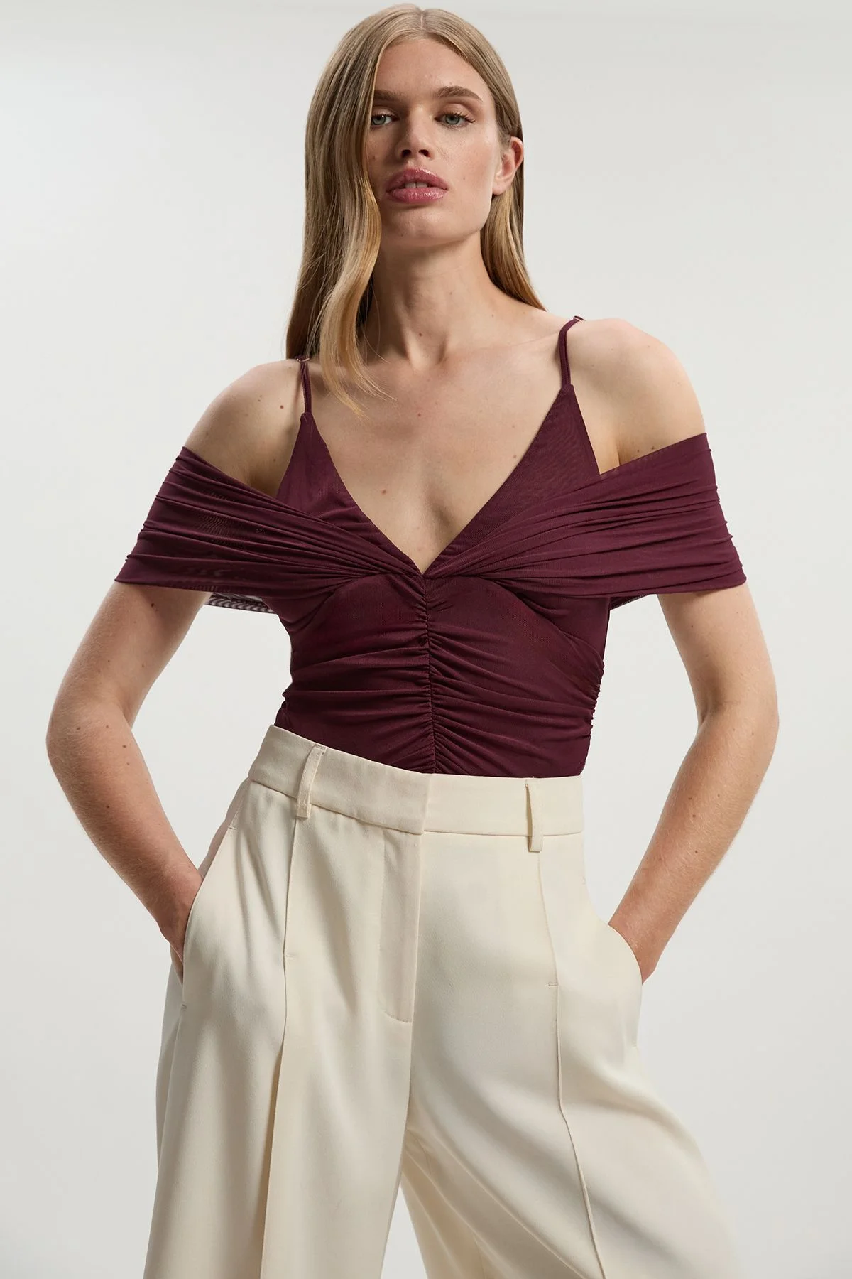 This Karen Millen bodysuit masterfully combines allure with sophistication through its distinctive mesh construction and plunge neckline. The thoughtful ruching across the bodice creates a flattering shape, whilst the off-shoulder design adds a touch of drama to your ensemble. The strappy detail and open back elevate this piece beyond the ordinary, making it ideal for cocktail parties or upscale dinners. The bodysuit's slim fit ensures a seamless foundation under any outfit, whilst offering enough stretch for comfortable movement throughout your event. Accessorise with statement earrings and a clutch bag to complete this refined look. Plunge neckline with strappy detail Mesh fabric with ruched detailing Off-shoulder design with adjustable straps Figure-hugging slim fit Open back design Product Details & Care Main: 95% Polyester, 5% Elastane/Spandex. Lining: 95% Polyester, 5% Elastane/Spandex. Wash inside out. Model wears: UKS. Model height: 5"9.