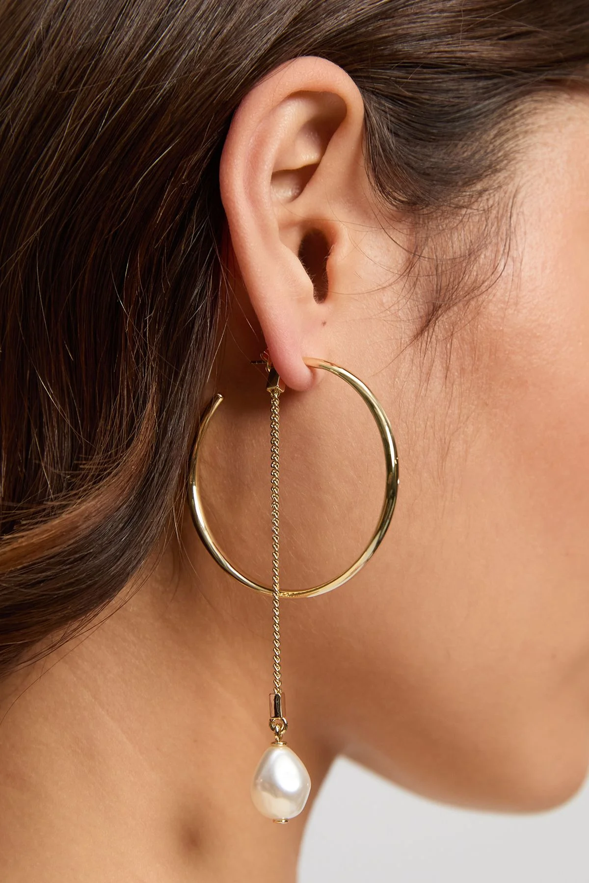 - Contemporary hoop design with elegant pearl drop detail - Delicate chain suspension creates movement and dimension - Smooth metallic finish with high-shine polish - Statement size that frames the face beautifully - Versatile day-to-evening accessory with timeless appeal These modern pearl hoop earrings reimagine classic jewellery with contemporary flair. The striking design features a sleek metallic hoop with a refined pearl suspended from a fine chain, creating a captivating sense of movement as you turn. Perfect for adding sophistication to formal attire, pair with an updo and fitted evening dress for weddings or graduations to showcase their elegant drop detail. For daytime polish, style with a tailored blazer and crisp white shirt to bring refinement to office ensembles. The versatile nature of these earrings allows them to transition effortlessly from boardroom meetings to evening soirees. Their distinctive silhouette offers just the right amount of drama whilst maintaining an air of understated elegance-a hallmark of the Karen Millen aesthetic that values expert craftsmanship and contemporary design. Product Details & Care Always put your Karen Millen jewellery on as a finishing touch after any perfumes or sprays. Keep away from water, sun cream, lotions, hand sanitiser, and other chemicals such as chlorine. To clean, we recommend using a soft cloth only - any chemicals or polishing liquids will wear away the plating. Jewellery should be carefully stored in the packaging provided. Always remember: It should be the last thing you put on in the morning, and the first thing you take off in the evening.