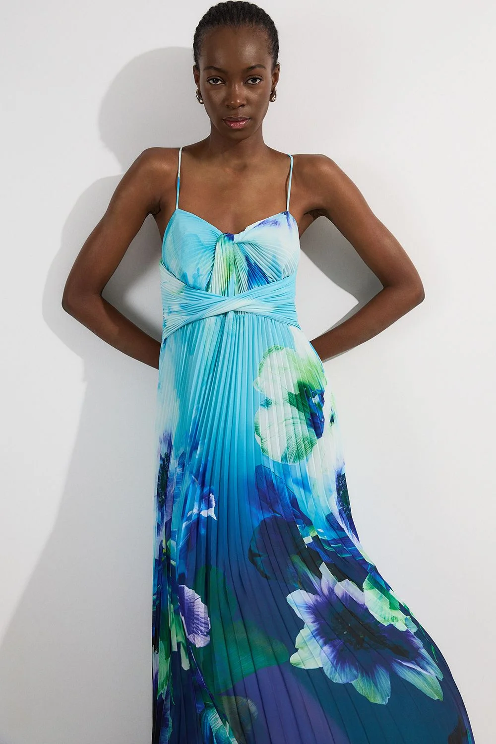 Make a statement at your next special occasion with this captivating ombre floral maxi dress from Karen Millen. The soft pleated fabric cascades beautifully, creating an ethereal effect as you move. The strappy design and cross-back detail add a touch of allure, while the sweetheart neckline and gathered bust flatter your figure. Perfect for summer weddings or garden parties, this dress can be styled with metallic sandals and a clutch bag for a refined ensemble. For cooler evenings, drape a lightweight shawl over your shoulders. The versatile design allows for both formal and semi-formal styling, making it a valuable addition to your wardrobe for various events throughout the season. Stunning ombre floral print maxi dress Soft pleated woven fabric for elegant movement Strappy design with cross-back detail Sweetheart neckline with gathered bust Floor-length silhouette for a dramatic look Product Details & Care Main: 100% Polyester. Lining: 100% Polyester. Wash inside out. Wash with similar colours. Model wears UK Size 8/ US Size 4. Model height approx: 5"9. Length approx: 126cm