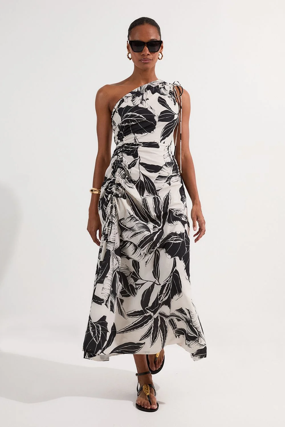 This captivating Karen Millen midi dress showcases a bold palm print that commands attention whilst maintaining effortless sophistication. The asymmetric one-shoulder neckline creates a flattering silhouette that draws the eye, whilst the lightweight cotton voile fabric ensures you stay cool and comfortable during sun-soaked days. Style with oversized sunglasses for a refined beach-to-bar look - perfect for sunset cocktails by the sea or leisurely strolls along the promenade. For daytime beachwear, pair with flat leather sandals and a woven tote, or dress up with strappy heels and statement jewellery for evening soiree on your summer holiday. The versatile midi length works beautifully for various occasions, making this a must-have addition to your warm-weather wardrobe. Striking one-shoulder design with elegant palm print Crafted from breathable cotton voile fabric Flowing midi length silhouette Subtle shoulder tie detail adding a touch of feminine charm Product Details & Care Shell: 100% Cotton. Lining: 100% Cotton. Wash with similar colours. Wash inside out. Model wears UK Size 8/ US Size 4. Model height approx: 5"9. Length approx: 120cm
