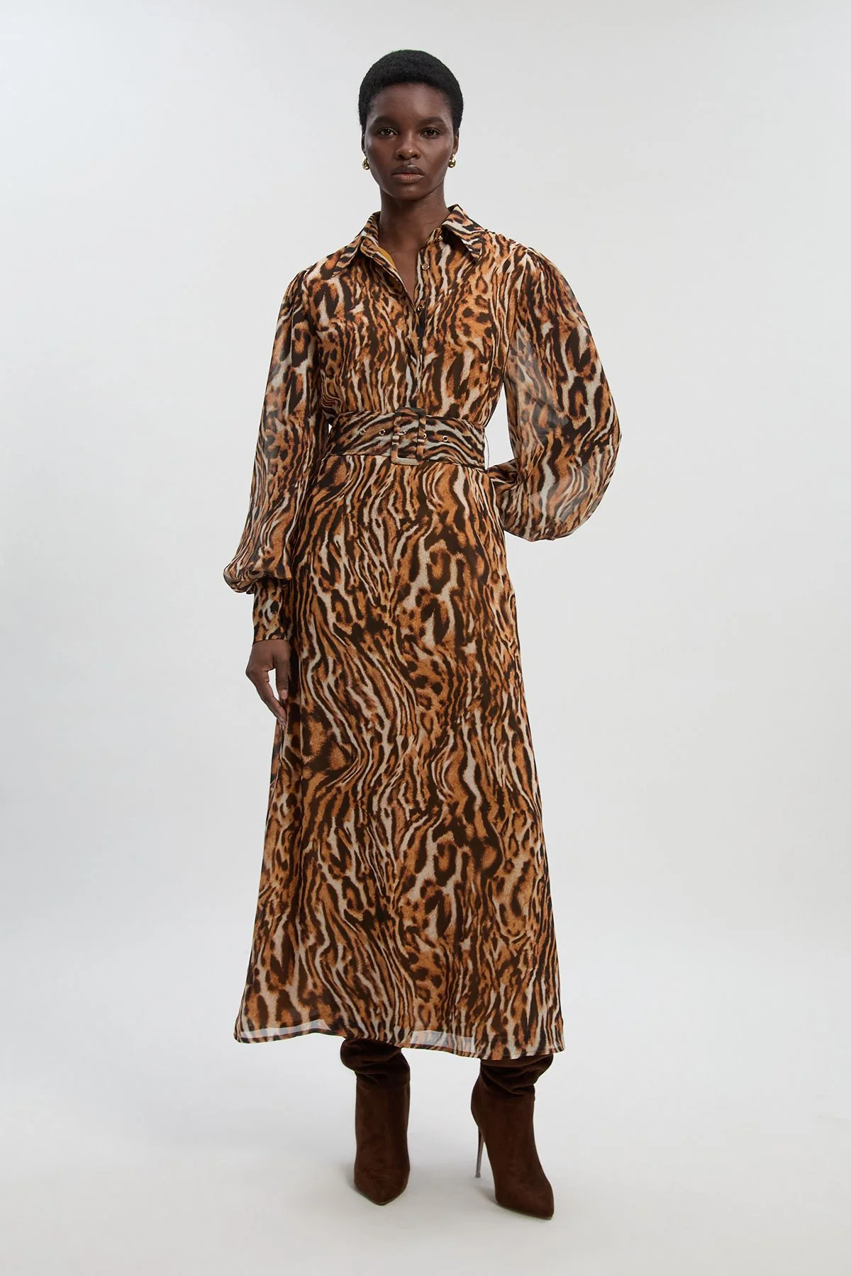 - Striking animal print georgette fabric with a lightweight, flowing drape - Elegant high neckline with classic shirt collar detailing - Dramatic balloon sleeves for a contemporary silhouette - Belted waist design to create a flattering, defined shape - Midi-length woven construction with a graceful, fluid movement This Petite Animal Print Shirt Dress from Karen Millen presents a sophisticated daywear option that combines classic styling with contemporary flair. The lightweight georgette fabric creates beautiful movement as you walk, whilst the belted waist cinches to create a feminine silhouette that works brilliantly for your petite frame. Style with brown suede ankle boots as shown for an effortlessly chic daytime look, or pair with flat leather sandals and a woven tote for casual weekend brunches. The versatile design transitions seamlessly from family gatherings to lunch dates, and can be layered with a tailored blazer for cooler days. The high neckline and midi length maintain a refined aesthetic whilst the bold print adds character to your everyday wardrobe. A true statement piece that doesn't compromise on comfort or sophistication. Product Details & Care Main: 100% Polyester, Lining: 100% Polyester, wash dark colours separately, Iron on reverse, Model wears UK 8/US 4.