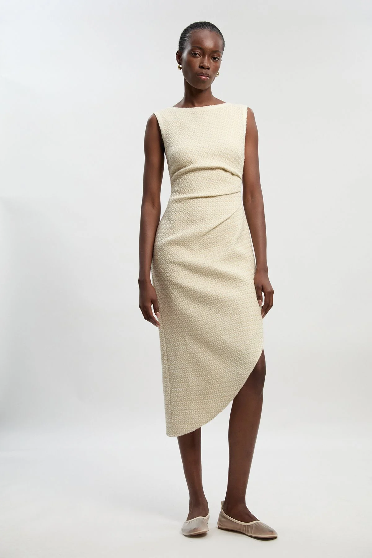- Textured boucle fabric adds sophisticated dimension to this tailored midi dress - Elegant ruched detailing across the waist creates a flattering silhouette - Sleeveless design with a refined boat neckline for a timeless appeal - Asymmetric hemline with side slit offers contemporary movement - Midi length measuring approximately 128cm for versatile styling options This boucle midi dress exemplifies Karen Millen's commitment to expert craftsmanship with its thoughtfully placed ruched detailing that contours the figure with refined elegance. The tailored silhouette strikes the perfect balance between structure and femininity, whilst the textured fabric adds a tactile element that elevates everyday dressing. Style with ballet flats for daytime sophistication as shown, or transform for evening occasions with pointed court shoes and statement earrings. The asymmetric hemline with subtle side slit creates visual interest and allows for ease of movement, making this piece suitable for everything from important meetings to gallery openings. A versatile addition to your wardrobe that transitions effortlessly from office to dinner engagements with a simple change of accessories. Product Details & Care Main 67% polyester, 32% cotton, 1% other fibres. Model height 5"9. Model wears UK8/US4. Length approx 128cm