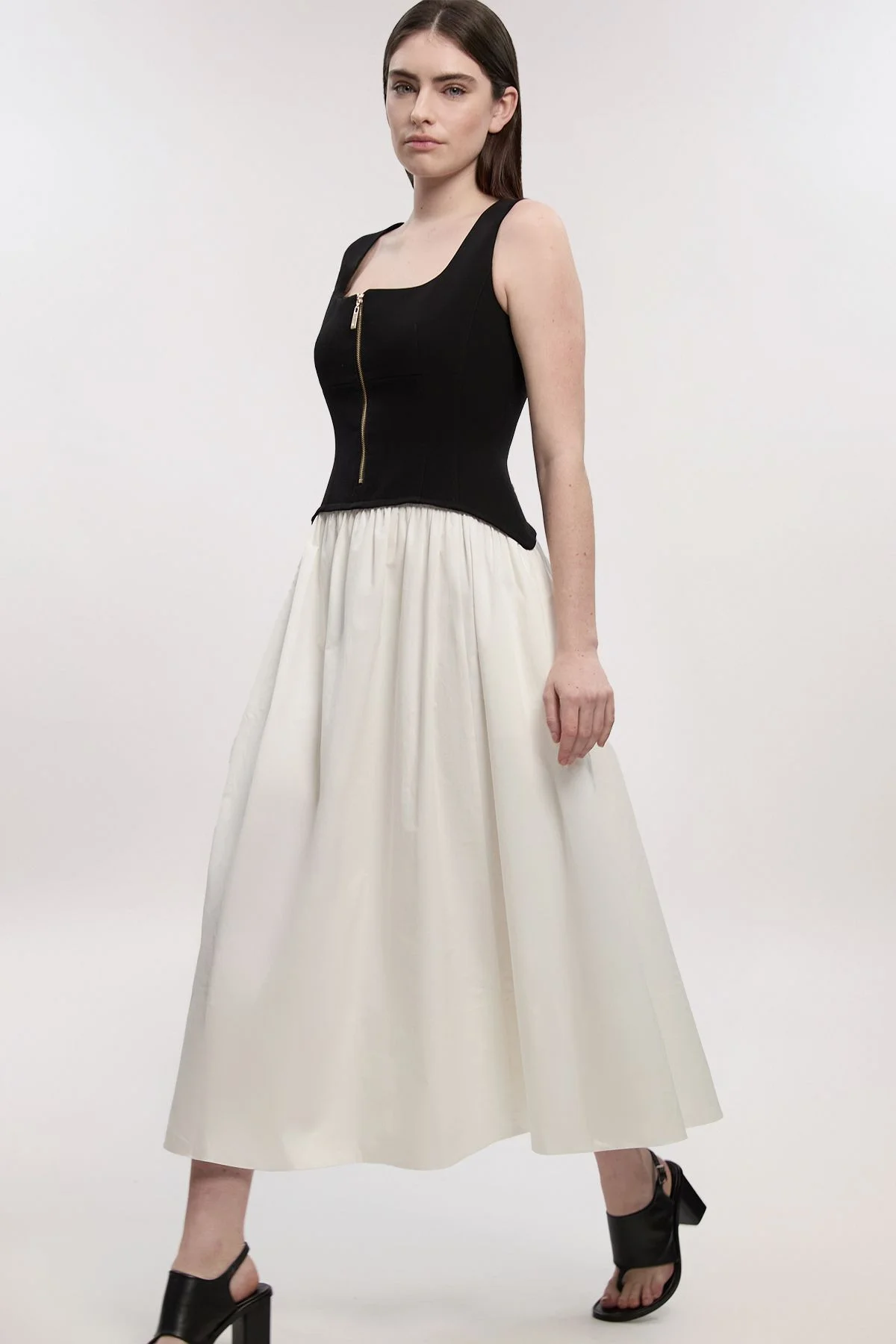 - Striking contrast design with fitted bodice and voluminous full skirt - Front gold-tone zip detail adds contemporary edge - Square neckline creates an elegant frame - Sleeveless silhouette perfect for transitional weather - Cotton mix fabric provides comfortable stretch with structured shape This tailored midi dress showcases expert craftsmanship through its architectural silhouette. The fitted bodice creates a flattering shape while the full skirt adds dramatic movement with every step. Style with block heel sandals and minimal jewellery for daytime events, or transform for evening with pointed court shoes and statement earrings. The versatile design works beautifully for garden parties, gallery openings or sophisticated brunches. The contrast between structured top and flowing skirt demonstrates contemporary design sensibility, while the midi length offers timeless appeal. This piece embodies refined style with a modern twist - a wardrobe investment that transitions effortlessly between seasons and occasions. Product Details & Care Main1: 65% polyester 29% viscose 6% elastane Main 2: 100% cotton Lining: 100% polyester. Dry clean only. Model wears UK8/US4. Model's height approx. 5'9" Length approx. 130cm