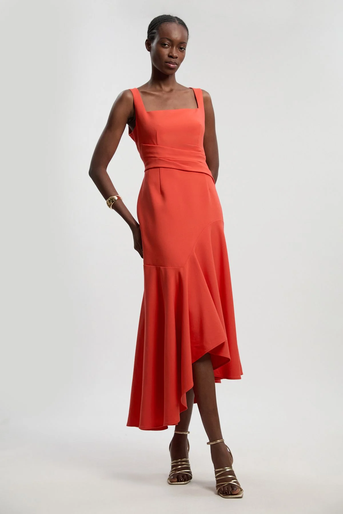 - Elegant square neckline with wide straps for sophisticated support - Structured waistband detail creates a flattering silhouette - Dramatic asymmetric hemline with fluid movement - Compact stretch fabric offers comfort with shape retention - Petite-friendly maxi length designed to complement smaller frames Make a striking entrance at your next formal occasion in this contemporary asymmetric maxi dress. The architectural square neckline frames the decolletage beautifully, while the structured waistband cinches to create a defined silhouette. The standout feature is undoubtedly the sweeping asymmetric hem that creates graceful movement as you walk. Style with strappy metallic heels and gold statement jewellery as shown for a refined evening ensemble. Perfect for weddings, race days or graduation ceremonies, this dress balances modern design with timeless elegance. The compact stretch fabric ensures both comfort and structure throughout your event, maintaining its shape as you transition from day to evening celebrations. A versatile addition to your occasion wardrobe that can be styled differently with each wear. Product Details & Care Main: 66% polyester, 28% viscose, 6% elastane. Model wears UK8/US4. Model height 5"9. Length approx: 130cm