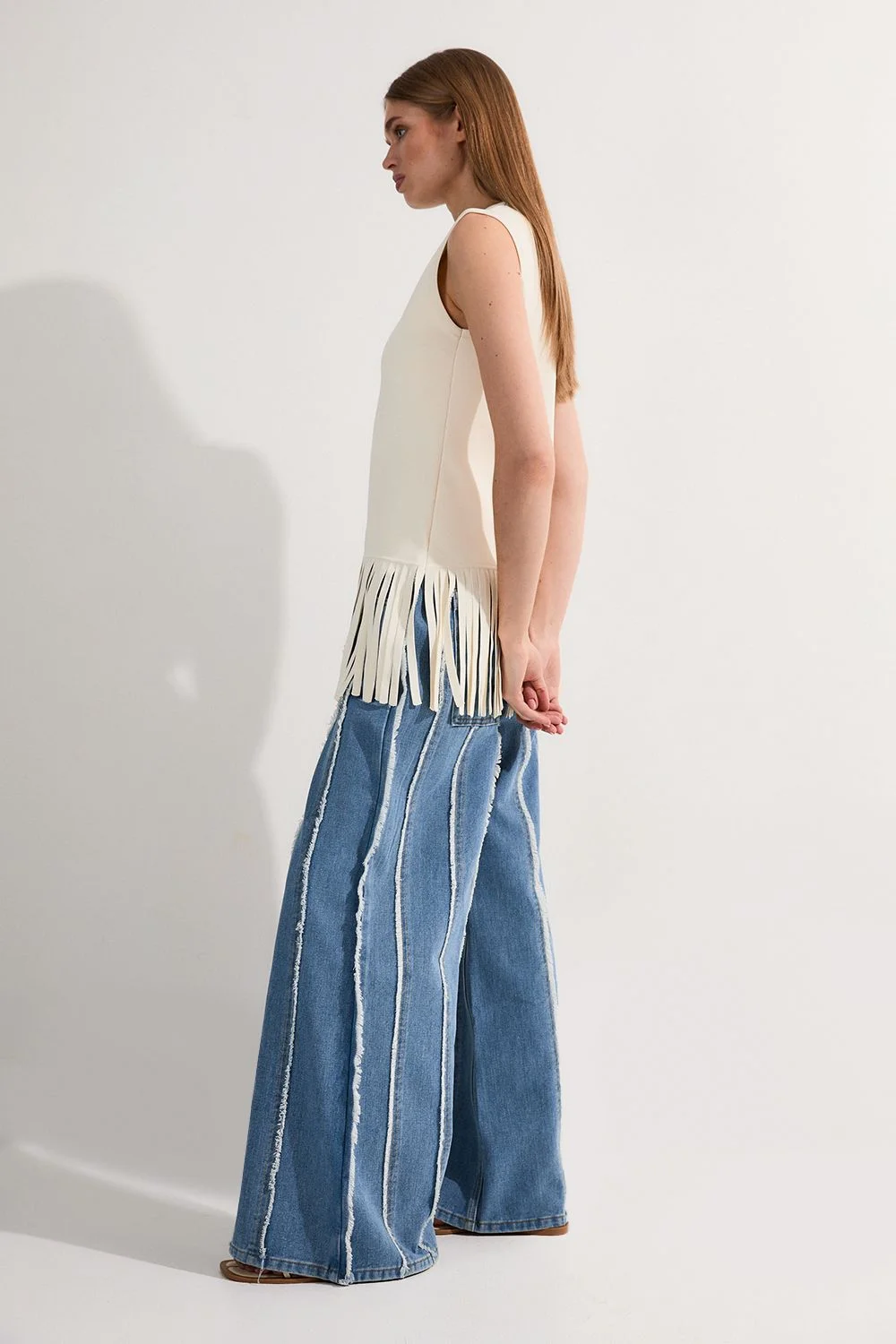 These statement Petite Denim Tassel Detail Wide Leg Jeans from Karen Millen present a bold take on casual denim. The dramatic wide-leg silhouette creates a flowing, relaxed shape that moves with every step, whilst the vertical frayed stripes elongate the frame. The regular fit ensures these jeans remain comfortable for all-day wear, making them perfect for weekend brunches, casual shopping trips or relaxed gatherings with friends. These versatile jeans will quickly become your go-to for effortlessly stylish daywear. Striking vertical tassel detailing Ultra-wide leg silhouette Regular fit design Distinctive frayed vertical stripes High-rise waistband Product Details & Care 59% Cotton, 23% Viscose/Rayon, 18% Polyester. Wash before wear to reduce the possibility of colour transfer. The dye gradually disperses through washing, giving the garment a distinctive worn effect. Avoid contact with light colours when wet as colour may transfer. Wash inside out. Iron on reverse. Due to the nature of the dyeing process there may be some colour transfer onto garments and upholstery. Model wears UK 8/US 4. Length approx 107cm