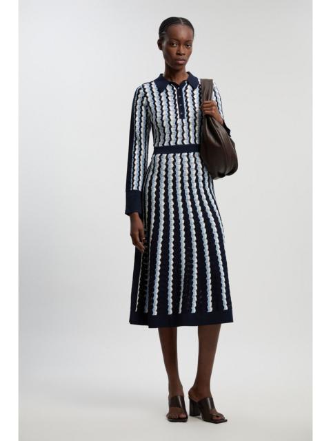 - Striking pointelle knit pattern creates visual interest and texture throughout the dress - Contrast collared neckline adds a sophisticated touch to this midi silhouette - Long sleeves with defined cuffs offer versatility across seasons - Defined waistband creates a flattering silhouette that accentuates your shape - Midi length design hits at mid-calf for an elegant, contemporary proportion This petite knit midi dress combines contemporary design with timeless elegance. The distinctive pointelle pattern creates a captivating visual effect whilst the contrast collar adds a refined touch that transitions effortlessly from day to evening. Style with leather mules and an oversized tote for a sophisticated workday ensemble, or switch to sleek heels and a clutch for evening drinks. The viscose-rich fabric ensures comfort without compromising on structure, making it ideal for those occasions that demand both refinement and ease. The defined waistband enhances your natural silhouette, whilst the midi length offers a modern proportion that works beautifully for formal meetings, gallery openings, or upscale brunches. This versatile piece can be layered with a tailored blazer during cooler months or worn alone when the temperature rises. Product Details & Care Main: 63% Viscose, 37% Polyamide. Machine wash. Due to the delicate nature of this fabric, care must be taken with jewellery and rough surfaces. Models wears UK size Petite Small. Models height approx: 5"3. Length approx: 109cm.