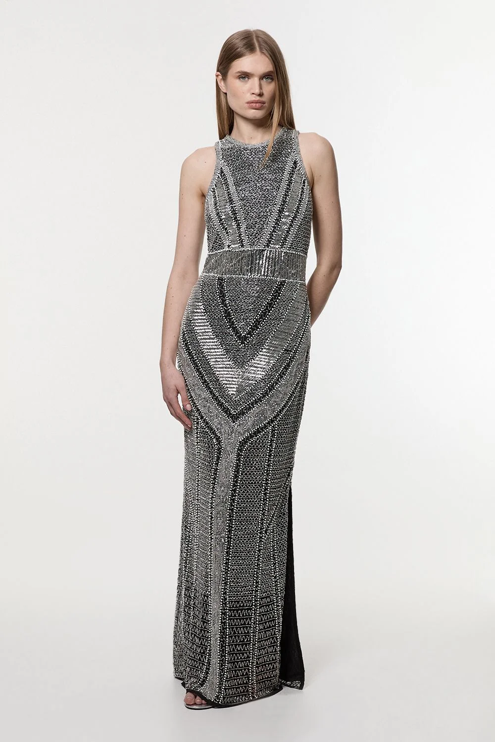 Make a captivating entrance in this show-stopping Karen Millen maxi dress. The halterneck design frames the decolletage, while the all-over beading and embellishment catch the light with every movement. The geometric pattern creates a flattering visual effect, drawing the eye along the body's natural contours. The structured silhouette with its defined waistband offers a sophisticated profile, whilst the floor-length design ensures a dramatic finish. For cooler evenings, drape a lightweight pashmina over your shoulders or add a tailored evening jacket for a refined ensemble that commands attention. Halterneck design with intricate beading and embellishment in a geometric pattern Figure-flattering maxi length Defined waistband Chevron detailing Product Details & Care Main: 100% Polyester. Lining 100% Polyester. Sequin: Plastic, Bead. Bead: Glass. Cool hand wash only. . Length approx 140cm.