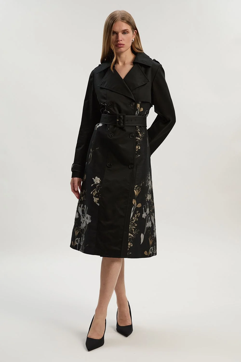 This Petite Printed Jacquard Trench Coat from Karen Millen masterfully blends timeless design with contemporary artistry. The cotton-blend fabric provides structure, whilst the distinctive jacquard print creates visual interest against the classic backdrop. The adjustable belt allows you to customise the silhouette to your preference; wear it cinched for a defined waistline or loosely tied for a more relaxed approach. This versatile piece transitions seamlessly from autumn strolls to spring showers, making it an indispensable addition to your outerwear collection. Jacquard print detailing Double-breasted design Wide lapel collar Adjustable belted waist Mid-length cut Product Details & Care Main 1: 100% Polyester. Main 2: 100% Cotton. Lining: 100% Polyester. Wash with similar colours. Wash inside out. Iron on reverse. Model wears UK 8/US 4. Model Height 5"9. Length approx: 125cm