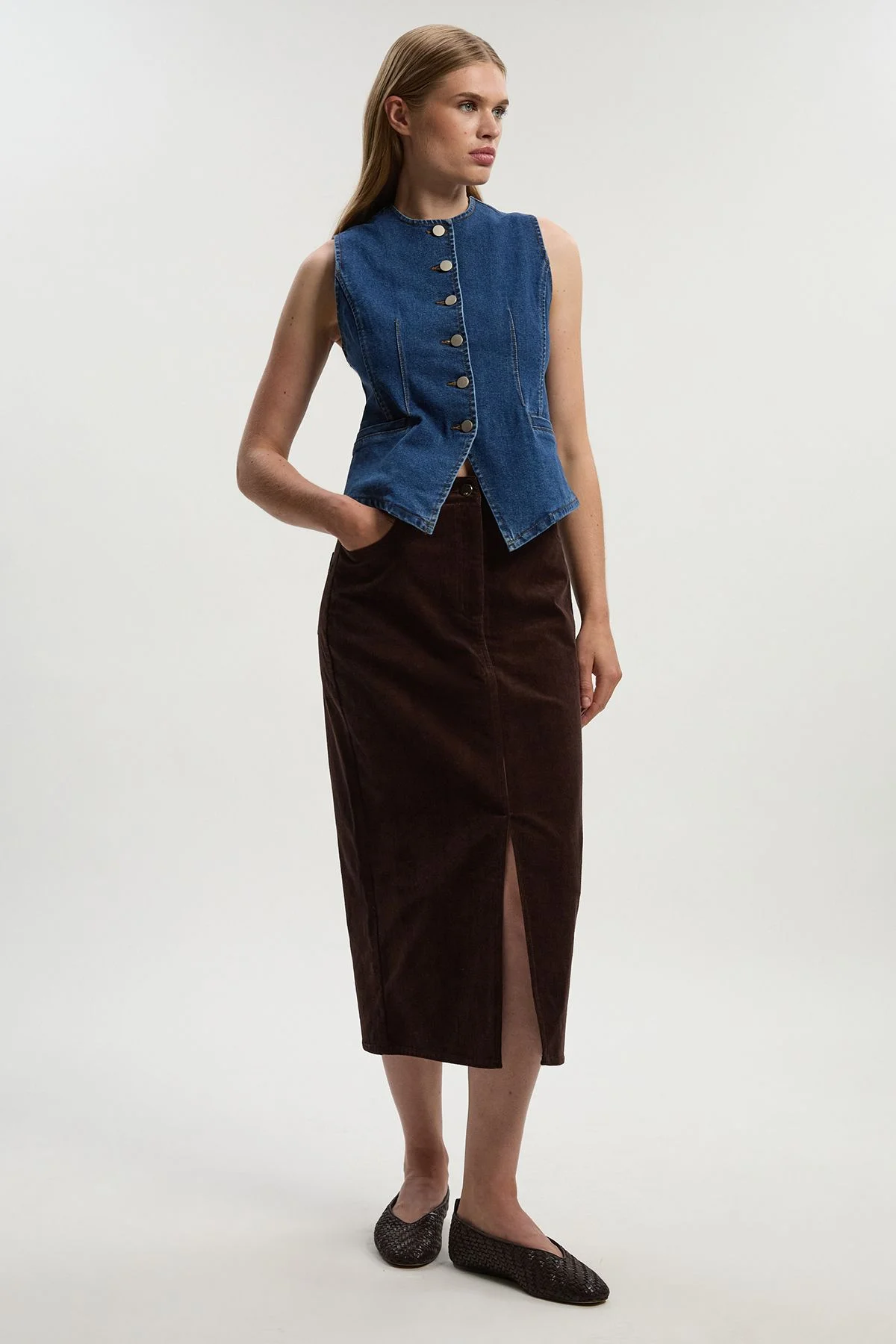 This Karen Millen Petite Stretch Cord Midi Pencil Skirt embodies sophisticated daywear with a contemporary twist. The textured cord fabric offers both structure and comfort, whilst the front split detail adds a subtle touch of intrigue to the classic pencil silhouette. The high-waisted design creates a flattering silhouette that works with tucked-in blouses or cropped tops. The midi length provides modest coverage whilst maintaining a modern aesthetic, making it an essential addition to your autumn and winter wardrobe rotation. Textured cord fabric Midi length Pencil silhouette Front split detail High-waisted design Product Details & Care 97% Cotton, 3% Elastane/Spandex. Model wears: UK8 / US4. Approx Length: 77cm