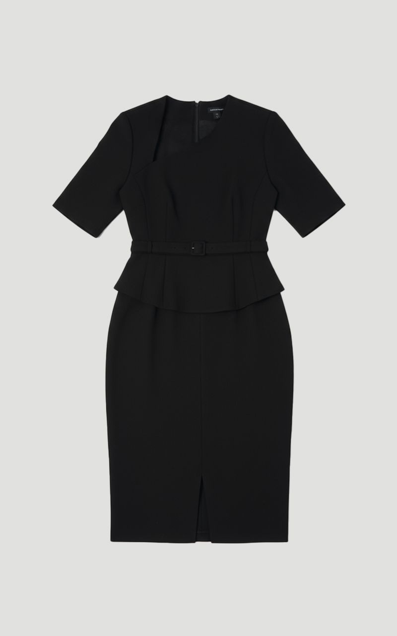 Petite Structured Crepe Forever Asymmetric Neck Belted Pencil Midi Dress