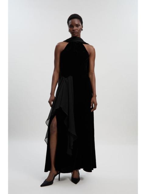 - Sumptuous velvet bodice with elegant cross-front halterneck design - Dramatic woven fabric overlay creates a striking asymmetric drape - Floor-sweeping maxi length perfect for petite frames - Sophisticated front split detail adds movement and allure - Fully lined for comfort and a flawless silhouette This Karen Millen Petite Velvet Cross Front Woven Maxi Dress embodies sophisticated glamour with its luxurious textural contrast. The halterneck design frames the decolletage beautifully whilst the cross-front bodice creates a flattering silhouette. The flowing woven overlay adds dramatic movement as you walk, with the front split offering both practicality and elegance. Perfect for formal occasions, this dress pairs exquisitely with pointed court shoes as shown and minimal jewellery to let the dress command attention. Add a structured clutch and a sleek updo for weddings or black-tie events. The maxi length has been specially proportioned for petite frames, ensuring the perfect fit without overwhelming your silhouette. This versatile piece transitions effortlessly from winter galas to summer evening soirees, making it a timeless addition to your occasion wardrobe. Product Details & Care Main: 1 100% Polyester, Main: 2 100% Polyester, Lining: 100% Polyester, Wash with similar colours, Turn inside out and place in a mesh laundry bag, Do not tumble dry, Do not bleach, Iron on reverse, Model wears UK 8/US 4. Length Approx: 128cm