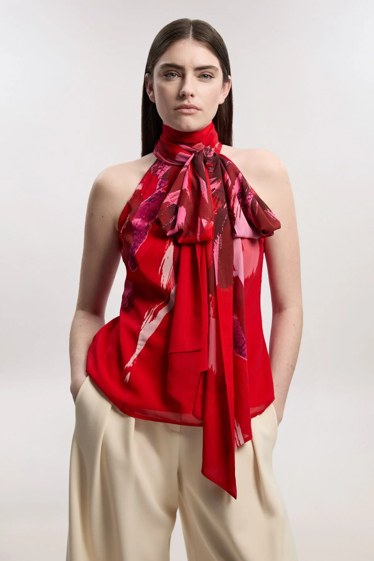 - Striking photographic floral print on crinkle georgette fabric for added texture and dimension - Elegant tie neck detail creates a sophisticated high neckline with dramatic drape - Sleeveless design perfect for showcasing statement jewellery while maintaining a refined silhouette - Fully lined for comfort and structure, ensuring a smooth fit against the skin - Versatile regular fit that works beautifully tucked into tailored trousers as shown or paired with pencil skirts This exquisite woven top combines artistry with elegance through its captivating photographic floral print on textured crinkle georgette. The statement tie neck creates a refined focal point that can be styled in multiple ways-tied in a classic bow for formal occasions or loosely draped for a more relaxed interpretation. The sleeveless cut offers sophisticated versatility, making it ideal for summer garden parties when paired with wide-leg trousers, or layered beneath a tailored blazer for important meetings. For evening events, style with a structured midi skirt and pointed court shoes to emphasise its occasion-worthy credentials. The regular fit ensures comfort without compromising on polish, while the fully lined construction speaks to Karen Millen's commitment to quality craftsmanship. This piece transitions effortlessly from day to evening, making it an indispensable addition to a curated wardrobe. Product Details & Care Main: 100% polyester Lining: 100% polyester. Machine wash only. Model wears Size UK 10/US Size 6. Model's height approx. 5'9".
