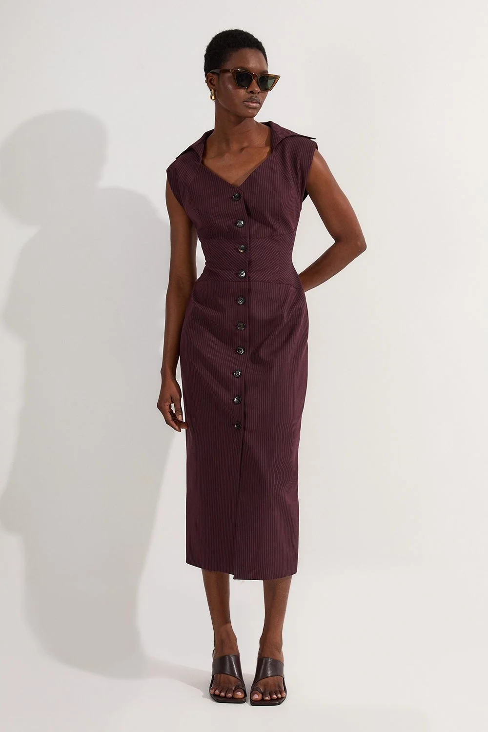 Make a lasting impression with this Karen Millen Pinstripe Corseted Tailored Pencil Midi Dress. Perfect for formal events, this dress combines classic tailoring with modern flair. The corset-inspired waist accentuates your figure, while the pinstripe pattern adds a touch of timeless elegance. Style it with pointed-toe court shoes and statement earrings for a polished look at weddings or important business meetings. For a more relaxed yet stylish ensemble, pair it with sleek ankle boots and a leather jacket. The versatile button-down front allows for customisation, letting you adjust the neckline to suit your preference. Whether you're attending a graduation ceremony or a day at the races, this dress will ensure you stand out for all the right reasons. Striking pinstripe pattern for a sophisticated look Corset-inspired waist detailing for a flattering silhouette Tailored pencil midi design with a sleek, form-fitting cut Collared neckline adding a touch of refinement Button-down front for versatile styling options Product Details & Care Main: 77% polyester, 20% viscose, 3% elastane. Model wears UK8/US4. Model height 5"9. Length approx: 125cm