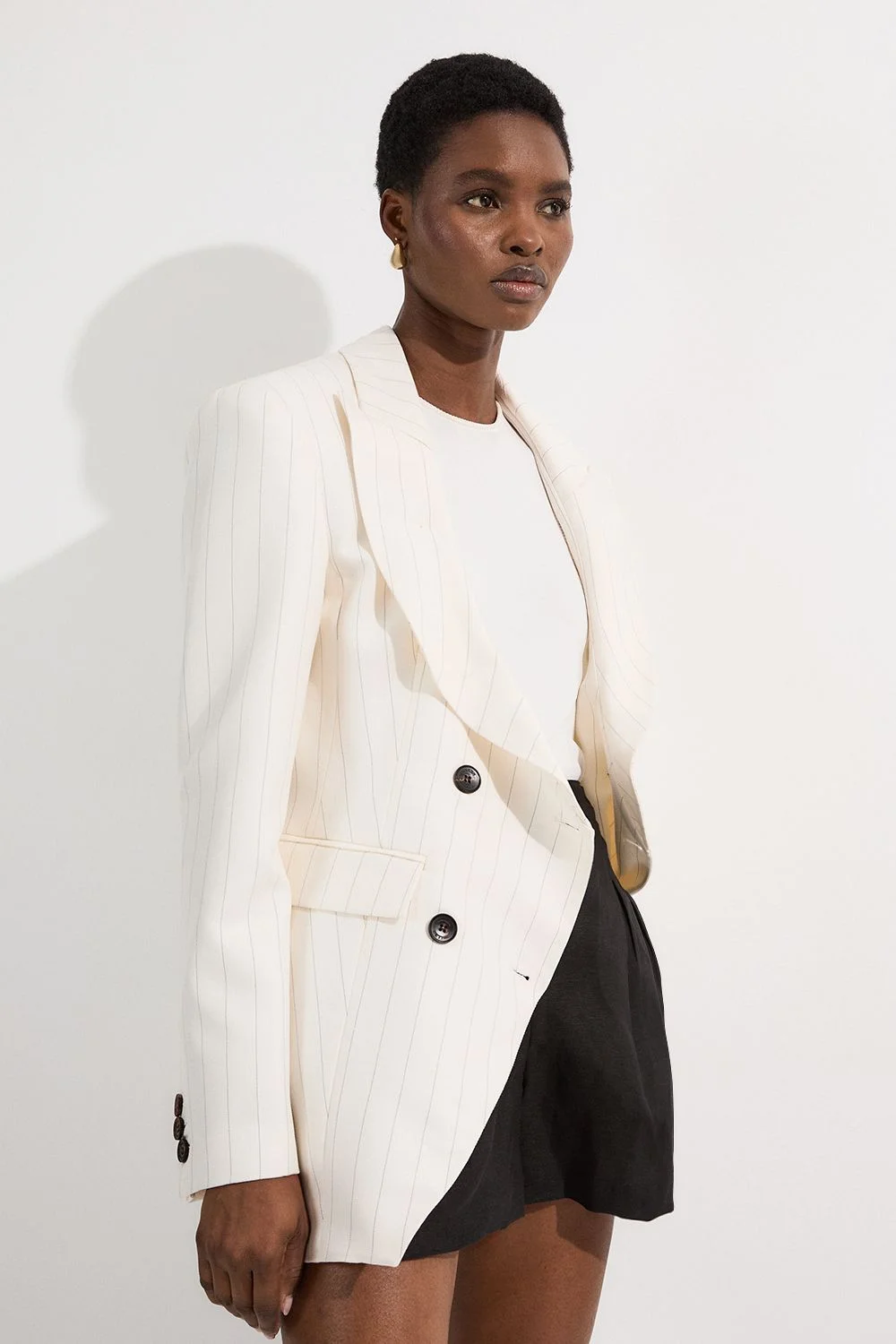 This Karen Millen tailored jacket embodies contemporary sophistication with its distinctive pinstripe pattern and waisted silhouette. The double-breasted fastening creates a structured look that defines the figure beautifully, whilst the classic collar adds a touch of traditional tailoring. Style with the matching trousers for a coordinated power suit, perfect for important meetings or formal occasions. For evening events, pair with a sleek camisole and tailored shorts as shown, adding statement jewellery and heels for a modern take on occasion dressing. The versatile design transitions effortlessly from boardroom to social gatherings, making it an essential investment piece for the discerning wardrobe. Double-breasted design with contrasting buttons for a sophisticated silhouette Elegant pinstripe pattern adds subtle texture and visual interest Tailored waist creates a flattering feminine shape Classic collared neckline offers timeless appeal Long sleeves with button detail for refined finishing Matching piece sold separately. Product Details & Care Main: 75% Polyester, 25% Flax. Model wears UK8/US4. Model height 5"9. Length approx: 70m