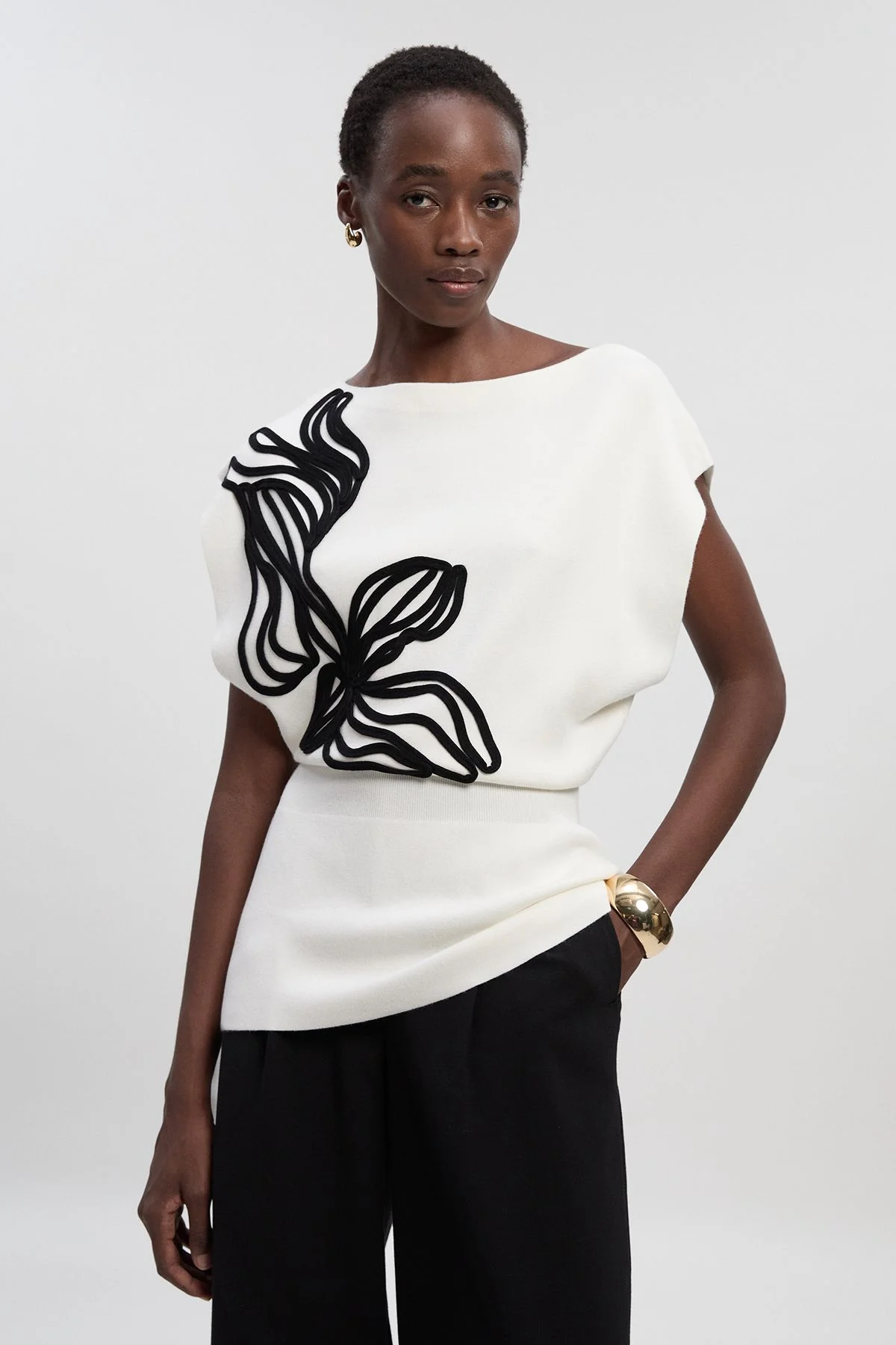 - Striking Cornelli embroidery creates an artistic floral motif across the front - Elegant asymmetric silhouette with a flattering draped effect - Sophisticated crew neckline balances the contemporary design - Cap sleeve styling offers graceful arm coverage - Fitted waist creates a feminine shape that accentuates your silhouette This Karen Millen knitted top combines artistic flair with everyday sophistication. The distinctive Cornelli embroidery creates a bold statement piece that's surprisingly versatile for daywear styling. Pair with wide-leg trousers as shown for a modern, balanced silhouette that works beautifully for family gatherings or lunch with friends. The contrast between the structured waist and the fluid draping adds dimension to your look, whilst the monochromatic palette ensures timeless appeal. Accessorise with statement gold jewellery to enhance the top's artistic quality. This piece transitions effortlessly from office to weekend brunch - simply switch your tailored trousers for dark denim and add a structured tote for a polished casual ensemble that reflects the Karen Millen commitment to craftsmanship with contemporary edge. Product Details & Care Body: 79% Viscose, 21% Polyamide. Embroidery: 100% Viscose. Machine wash. Models wears UK size Small. Models height approx: 5"9.