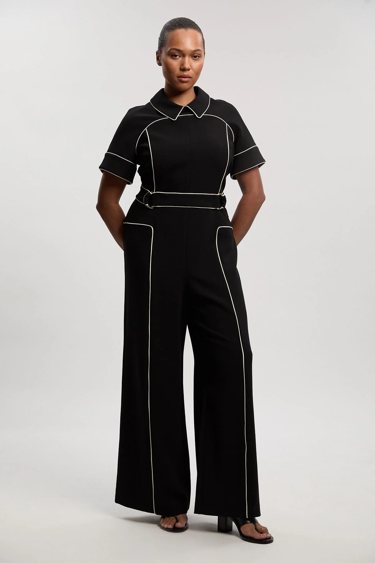 - Striking contrast piping detail throughout creates architectural definition and visual interest - Tailored collar adds a sophisticated touch to this contemporary jumpsuit - Wide leg silhouette offers elegant movement and a flattering shape - Practical side pockets provide functionality without compromising the clean lines - Tab detail at the waist creates definition and enhances the structured aesthetic This tailored jumpsuit redefines corporate dressing with its modern approach to workwear. The contrast piping creates a striking visual framework that accentuates the thoughtful construction, while the wide-leg cut ensures both comfort and sophistication. Perfect for important meetings when paired with pointed court shoes and a structured tote, or style with strappy heels and statement earrings for evening events. The compact stretch fabric offers ease of movement whilst maintaining shape throughout the day. The collared neckline and tab detail at the waist demonstrate expert craftsmanship, creating a refined silhouette that transitions effortlessly from boardroom to dinner. This versatile piece works beautifully layered under a cropped blazer during cooler months or worn alone as a statement ensemble when the occasion calls for understated confidence. Product Details & Care Main: 65% polyester, 35% viscose. Model wears UK18. Model height 5"9. Inseam length approx: 75cm