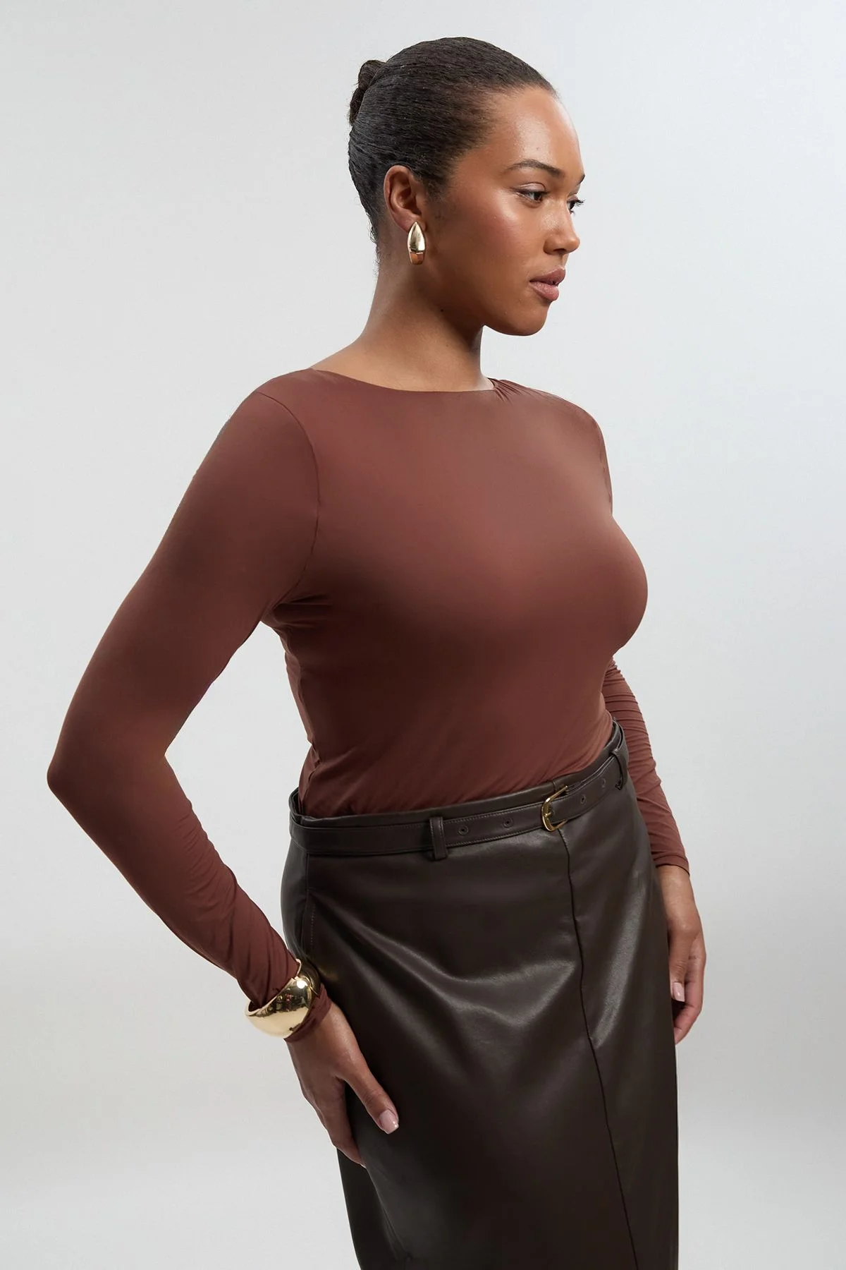 - Elegant boat neck design creates a sophisticated silhouette - Contour jersey fabric offers exceptional stretch and shape retention - Scoop back detail adds an unexpected touch of allure - Long sleeves provide versatile styling options across seasons - Slim fit showcases your curves with flattering definition This contour jersey top embodies Karen Millen's commitment to expert craftsmanship with its impeccable fit and thoughtful details. The boat neckline presents a refined daytime look, while the surprising scoop back adds interest when you turn. The slim-fitting silhouette skims your curves beautifully, making it perfect for tucking into high-waisted trousers or skirts. Style as shown with a pleated midi skirt and statement boots for sophisticated daywear, or pair with tailored wide-leg trousers and ballet flats for family gatherings. The stretchy jersey construction ensures comfort throughout the day whilst maintaining its shape. This versatile piece transitions effortlessly from casual coffee dates to smart-casual office settings, making it an indispensable foundation for your polished everyday wardrobe. Product Details & Care Main: 75% nylon, 25% elastane. Model wears UK18. Model height 5"9. Length approx: 55cm