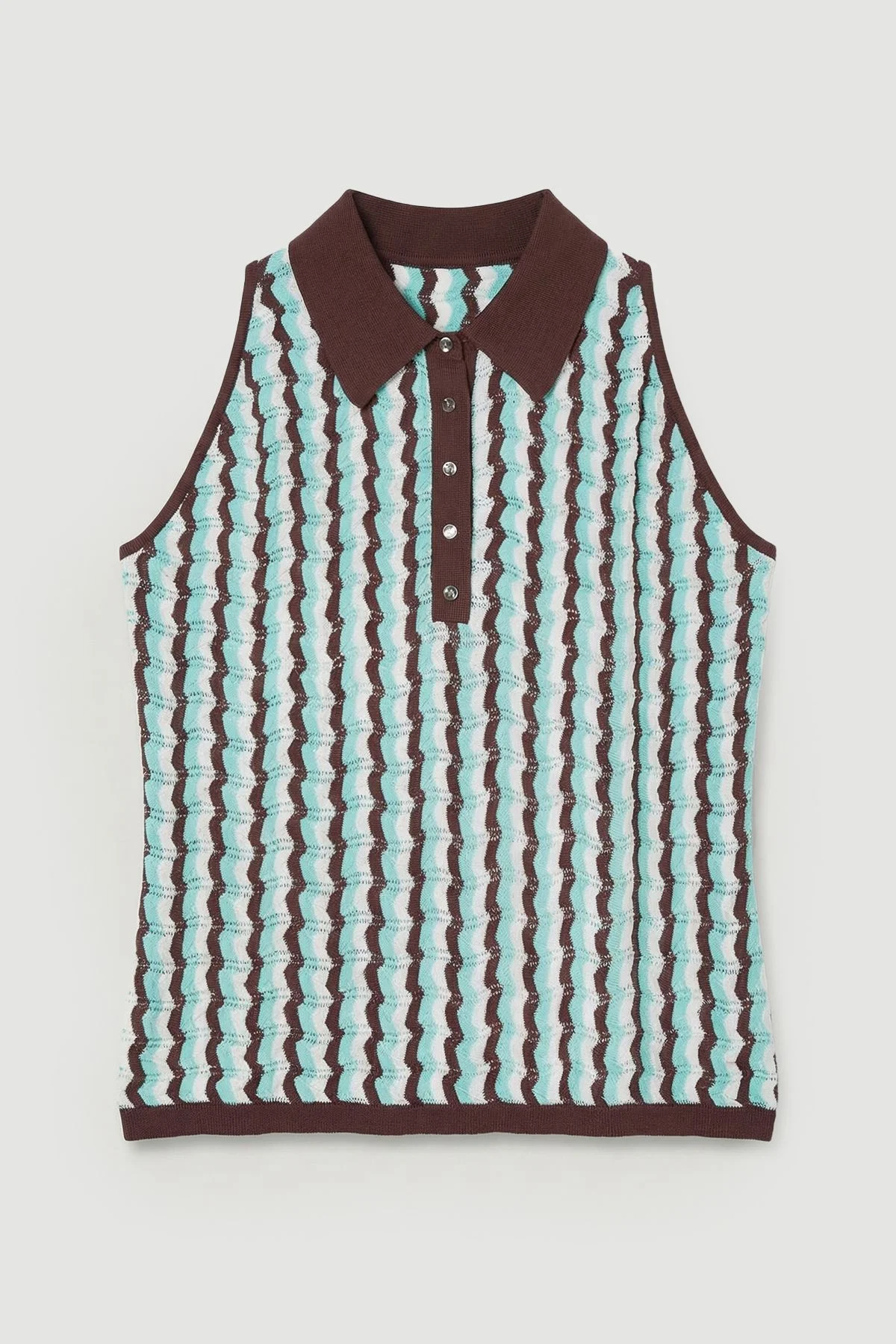 - Striking pointelle knit pattern creates visual interest and texture throughout - Contrast collar adds a sophisticated touch to this sleeveless design - Slim fit silhouette accentuates your shape with elegant precision - Button placket detail offers a refined finishing touch - Midi length provides versatile styling options for various occasions This sleeveless knit top combines contemporary design with timeless elegance. The intricate pointelle pattern creates a distinctive textural element whilst the contrast collar adds a refined touch that frames your neckline beautifully. Perfect for elevated daywear, style with tailored trousers and court shoes for a sophisticated office ensemble, or pair with a structured blazer and statement earrings for important meetings. The midi length offers excellent versatility, working equally well with slim-fit trousers or a pencil skirt. The viscose-blend fabric ensures comfort throughout the day whilst maintaining a polished appearance. This Karen Millen piece embodies expert craftsmanship and attention to detail, making it an essential addition to your curated wardrobe of contemporary classics. Product Details & Care Main: 63% Viscose, 37% Polyamide. Machine wash. Due to the delicate nature of this fabric, care must be taken with jewellery and rough surfaces. Models wears UK size L. Models height approx: 5"9.