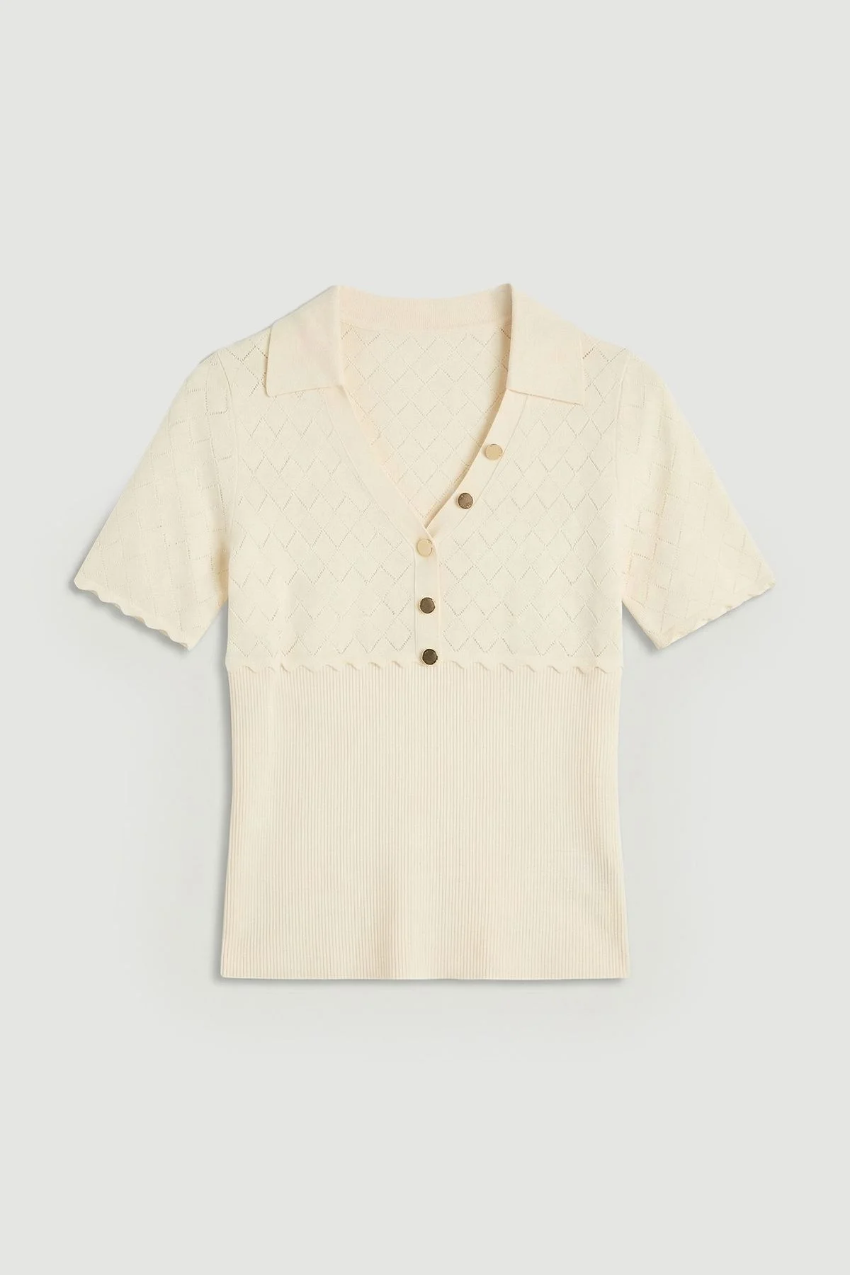 - Elegant collared design with sophisticated button-through detail - Distinctive knit stitch pattern across the upper portion creates visual interest - Ribbed lower section offers a flattering slim fit - Short sleeves with delicate scalloped edges for a refined finish - Versatile plus size silhouette designed to complement your curves This Karen Millen collared top combines contemporary design with timeless appeal. The contrasting textures-featuring an intricate stitch pattern above and sleek ribbing below-create a sophisticated visual dimension that transitions effortlessly from day to evening. Style with tailored trousers and court shoes for important meetings, or pair with wide-leg linen trousers and statement earrings for elegant weekend brunches. The button detail adds a touch of refinement while the slim fit silhouette ensures a polished appearance. Perfect for the woman who appreciates considered craftsmanship, this versatile piece works beautifully layered under a structured blazer for formal occasions or worn alone with high-waisted denim for a more relaxed interpretation of smart-casual dressing. Product Details & Care Main: 53% Polyamide, 47% Viscose. Machine wash. Due to the delicate nature of this fabric, care must be taken with jewellery and rough surfaces. Models wears UK size L. Models height approx: 5"9.