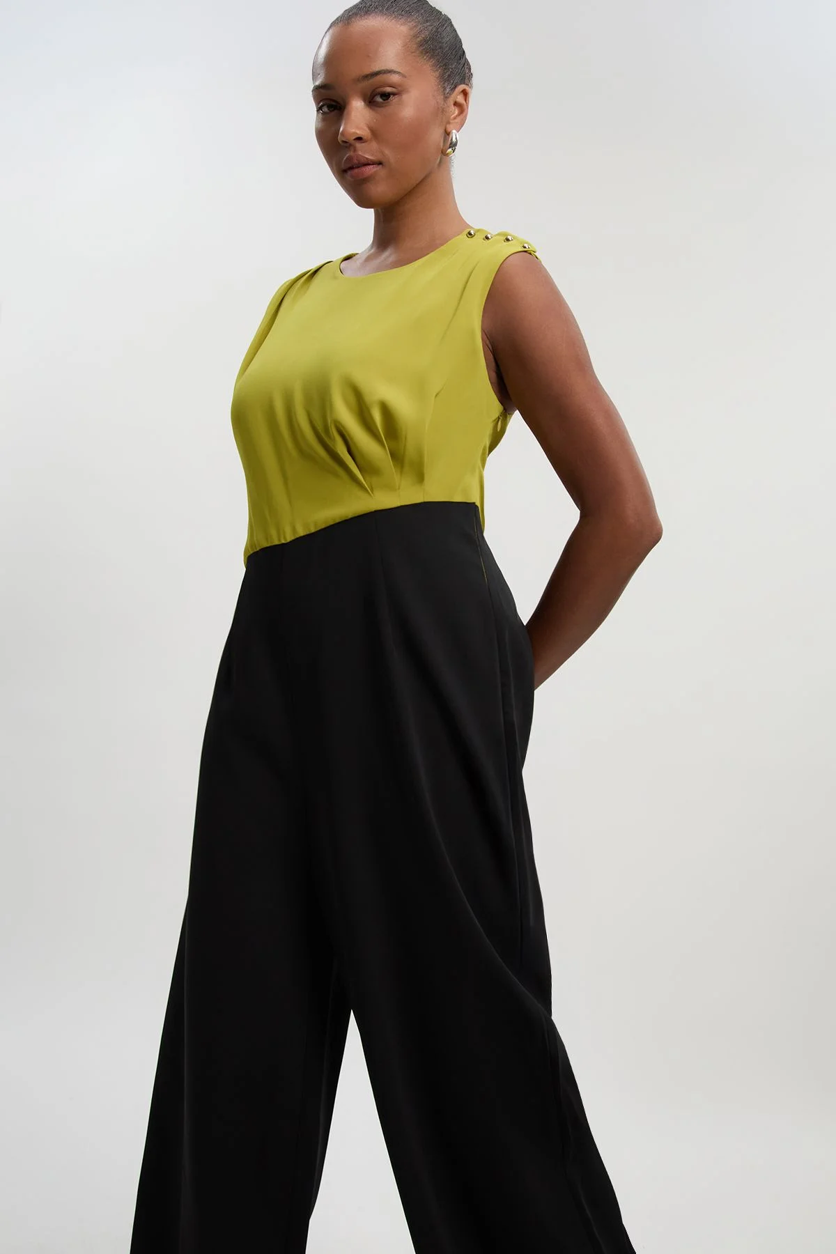 - Striking asymmetric neckline creates a contemporary silhouette - Soft tailored design with elegant wide leg cut for effortless movement - Distinctive two-tone colour blocking for a bold, fashion-forward look - Decorative button detail on shoulder adds subtle interest - Practical side pockets perfect for everyday functionality This sophisticated jumpsuit combines comfort with contemporary design, making it a versatile addition to your daywear collection. The asymmetric neckline creates visual interest while the wide leg silhouette offers both comfort and a fashion-forward aesthetic. Style with minimal jewellery and flat sandals for casual family gatherings, or dress up with statement earrings and a structured tote for lunch with friends. The soft tailoring ensures a flattering fit that works beautifully for various body types, while the contrast colour blocking creates a slimming effect that enhances your natural shape. Perfect for those moments when you want to look polished without compromising on comfort, this Karen Millen piece embodies the brand's commitment to expert craftsmanship with a modern twist. Pair with a cropped jacket for cooler days or wear alone to showcase its distinctive design. Product Details & Care Main 1: 100% Polyester, Main 2: 100% Polyester, Lining: 100% Polyester Do not wash, do not bleach, do not tumble dry, cool iron on reverse, dry clean only in mild solvent, keep away from fire Model wears: UK18 /US14. Models height approx: 5"9. Length approx: 144cm.