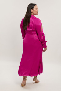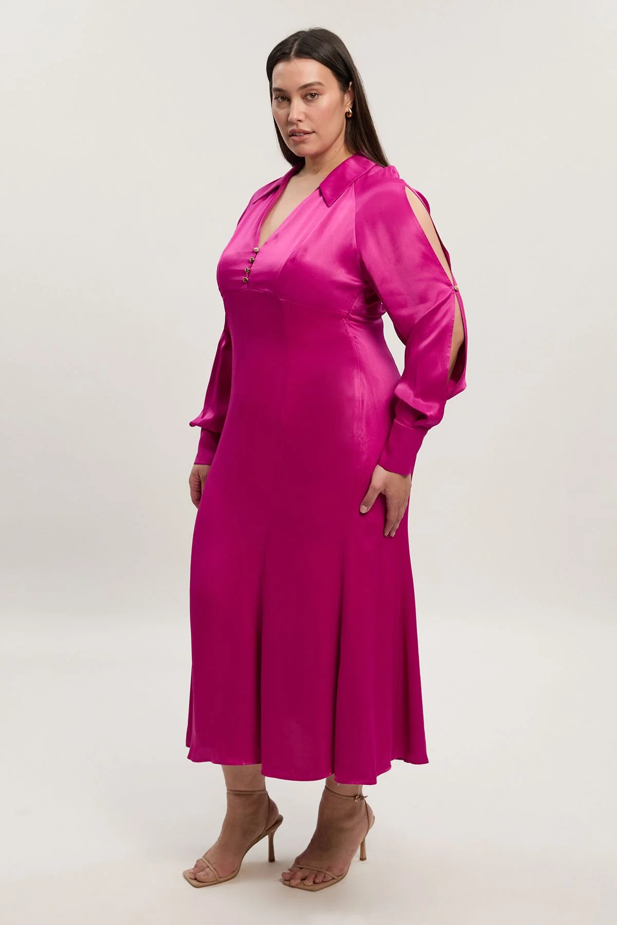 - Elegant viscose satin midi dress with a sophisticated V-neckline and collared detail - Statement split sleeves with button fastening for a contemporary design element - Decorative button detailing along the neckline adds refined interest - Flattering midi length with a gentle flare to the skirt for graceful movement - Long sleeves with fitted cuffs create a polished silhouette This Karen Millen woven midi dress exemplifies sophisticated daywear with its lustrous satin finish and thoughtful design details. The collared V-neckline with button accents creates a flattering frame, while the split sleeve detail offers a contemporary twist on classic styling. The fluid silhouette gently skims the figure before falling to a graceful midi length, perfect for effortless day-to-night transitions. Style with strappy heels as shown for family gatherings or special lunches, or dress down with leather ankle boots and a structured tote for a polished everyday look. For cooler days, layer with a tailored blazer or lightweight cardigan to maintain the dress's elegant lines. This versatile piece works beautifully for casual office settings, weekend brunches, or gallery visits when you want to combine comfort with unmistakable sophistication. Product Details & Care Main: 100% Viscose, Lining: 100% Polyester, Wash with similar colours, Wash inside out, Iron on reverse whilst damp, Model wears UK 18/ US 16. Length Approx: 142cm