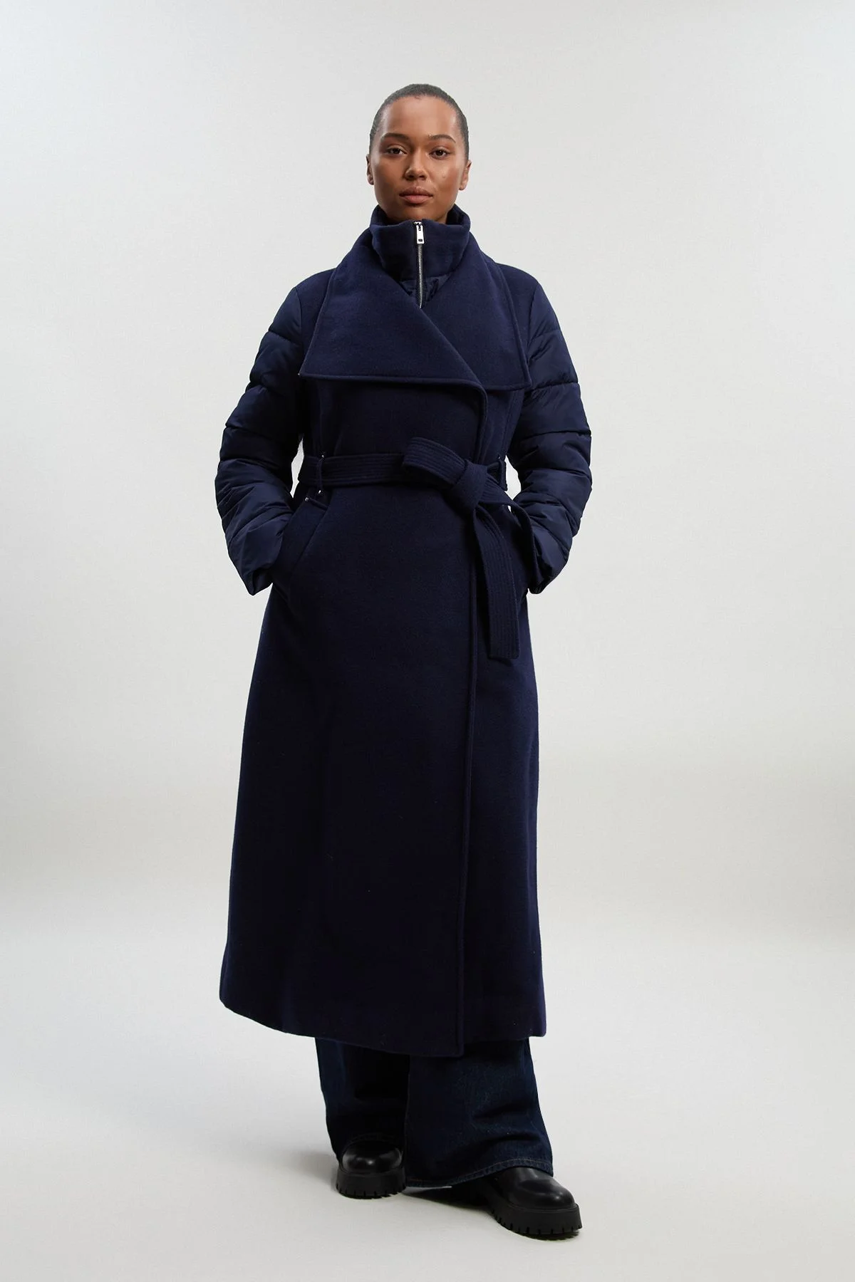 - Innovative hybrid design combining wool blend body with quilted puffer sleeves - Sophisticated high neck with zip detail for additional warmth and style - Flattering belted waist creating a defined silhouette - Midi length offering generous coverage for colder seasons - Practical side pockets perfect for keeping essentials close at hand Make a statement in this distinctive hybrid coat from Karen Millen, thoughtfully designed for the modern woman who values both style and practicality. The wool blend construction provides warmth whilst the quilted puffer sleeves add contemporary interest to this sophisticated silhouette. The belted waist creates a flattering shape that can be adjusted to your preference, whether worn cinched for definition or loosened for a more relaxed feel. Style as shown with wide-leg trousers and chunky footwear for an effortlessly chic daytime look, or pair with slim-fit jeans and ankle boots for weekend outings. This versatile piece transitions seamlessly from casual coffee dates to family gatherings, offering polished sophistication for your everyday wardrobe. The generous midi length ensures you stay comfortably warm during cooler months whilst maintaining an elegant profile. Product Details & Care Shell: 54% Wool, 40% Polyester, 4% Acrylic, 2% Polyamide. Sleeve: 100% Polyester. Lining: 100% Polyester. Filling: 100% Polyester. Model wears UK18 / US16. Approx length: 140cm