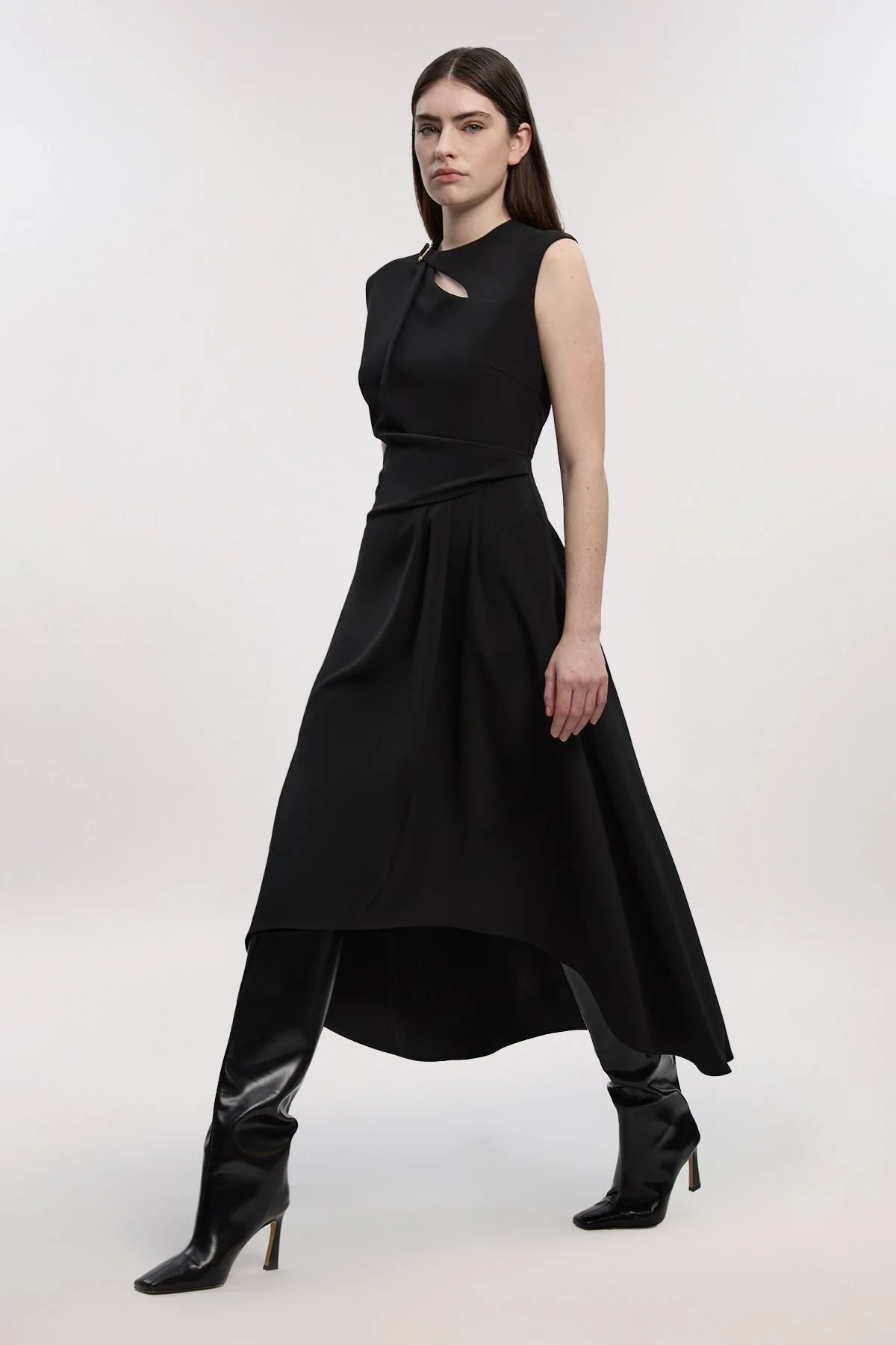 - Elegant drape neck design with sophisticated cut-out detail at the neckline - Sleeveless silhouette with a refined crew neckline for contemporary appeal - Structured waistband creates a flattering, defined silhouette - Full skirt with dramatic draping and asymmetric hemline - Midi length offering versatile styling options for various occasions This tailored drape neck dress exemplifies modern sophistication with its architectural silhouette and considered details. The structured bodice features an elegant cut-out detail, while the full skirt creates dramatic movement with its flowing asymmetric hemline. Style with statement knee-high boots for a contemporary daytime look with edge, or pair with pointed court shoes and minimal jewellery for refined evening events. The dress transitions effortlessly from professional settings to dinner engagements, making it a versatile addition to your wardrobe. The tailored fit through the bodice contrasts beautifully with the fluid skirt, creating a balanced silhouette that's both striking and wearable. This piece embodies the craftsmanship and attention to detail that defines the Karen Millen aesthetic. Product Details & Care Main: 91% polyester 9% elastane Lining: 100% polyester. Dry clean only. Model wears UK10/US6. Model's height approx. 5'9" Length approx. 112cm