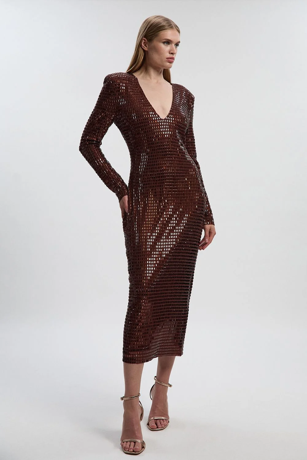 - Striking crystal embellishment creates a captivating textured finish that catches the light beautifully - Sophisticated plunge neckline adds a touch of allure to this elegant midi silhouette - Long sleeves provide refined coverage whilst maintaining the dress's statement appeal - Figure-defining cut showcases expert craftsmanship with a contemporary edge - Midi length offers versatility for various formal occasions whilst maintaining a polished aesthetic Make an unforgettable entrance in this crystal embellished midi dress, where contemporary design meets timeless sophistication. The plunge neckline creates a flattering focal point, whilst the long sleeves add a refined touch to this statement piece. The all-over crystal embellishment creates a mesmerising effect as you move, ensuring all eyes are on you. Style with minimal strappy heels as shown for elegant balance, allowing the dress to command attention. Perfect for weddings, formal dinners, or milestone celebrations, this dress transitions effortlessly from day to evening events. For cooler occasions, pair with a tailored evening coat and structured clutch to maintain the dress's refined silhouette. The midi length offers practical elegance, whilst the form-fitting cut demonstrates Karen Millen's commitment to exceptional tailoring that celebrates the feminine form. Product Details & Care 95% Polyester, 5% Elastane/Spandex, Embellishment: Glass Cool hand wash only separately with mild detergent, wash inside out, do not bleach, do not tumble dry, do not iron, do not dry clean, keep away from fire. Models wears UK size Small. Models height approx 5"9. Length approx: 126cm.