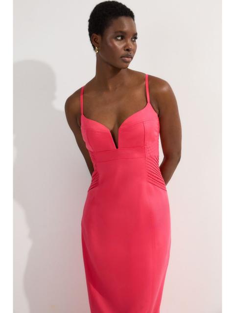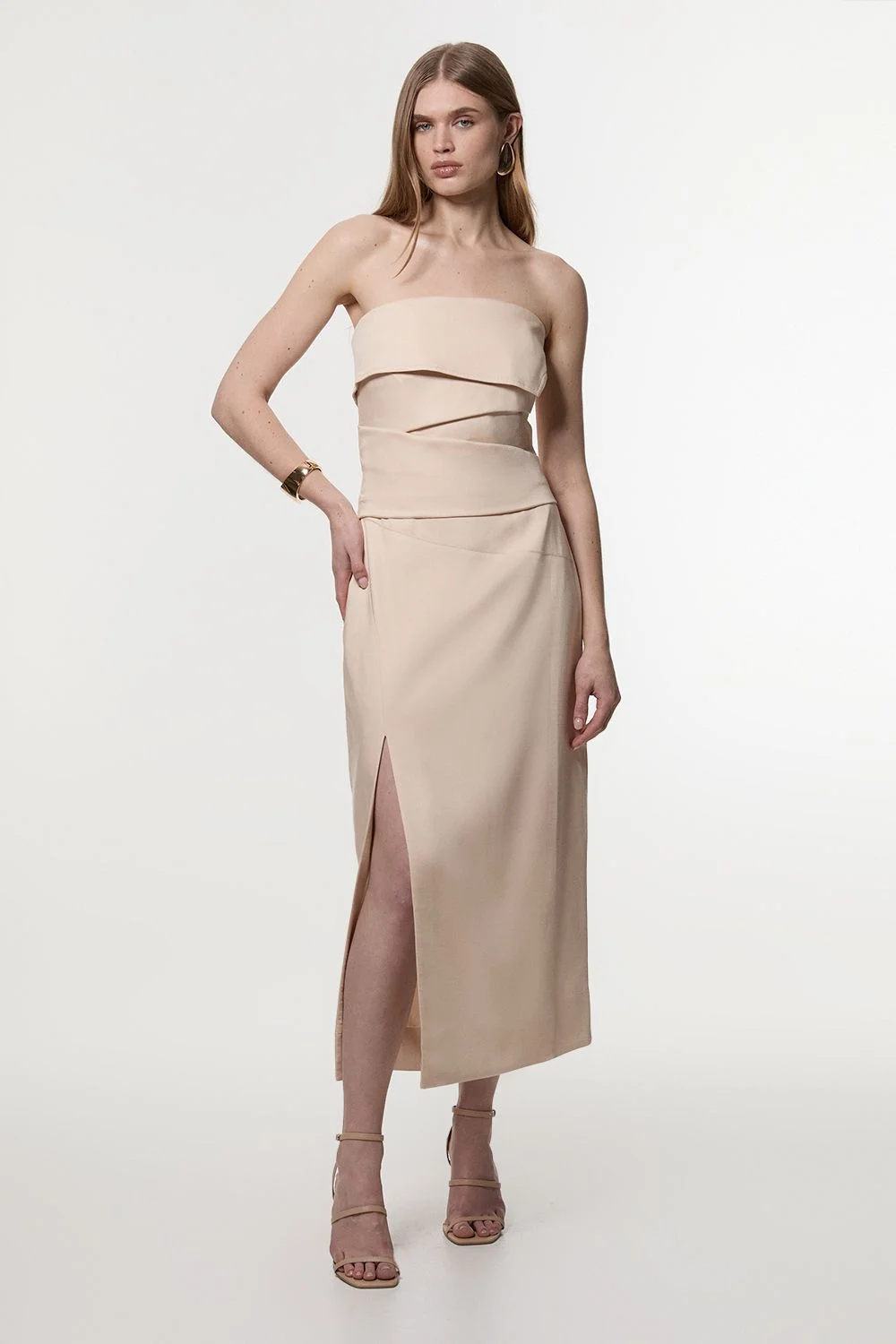 This Karen Millen dress embodies refined elegance with a contemporary twist. The structured bandeau neckline creates a sleek, polished look, while the pleated bodice adds a touch of intrigue. The tailored midi pencil silhouette sculpts your form, accentuating your curves with grace. A front slit not only allows for easier movement but also introduces a subtle hint of allure. Perfect for formal occasions, this dress can be styled with strappy heels and statement earrings for a wedding or paired with a tailored blazer for a sophisticated office ensemble. The versatile design transitions seamlessly from day to night, making it an invaluable addition to any woman's wardrobe. Its timeless appeal ensures you'll turn heads at any event, from cocktail parties to gallery openings. Structured bandeau neckline for a sophisticated strapless look Pleated bodice detailing adds visual interest and texture Tailored midi pencil silhouette flatters the figure Front slit enhances ease of movement Linen-blend fabric offers breathability and a luxurious feel Product Details & Care Main: 87% Lyocell, 13 Linen. Lining: 89% Polyester, 11% Cotton. Dry Clean Only. Model wears UK Size 8/ US Size 4. Model height approx: 5"9. Length approx: 107cm